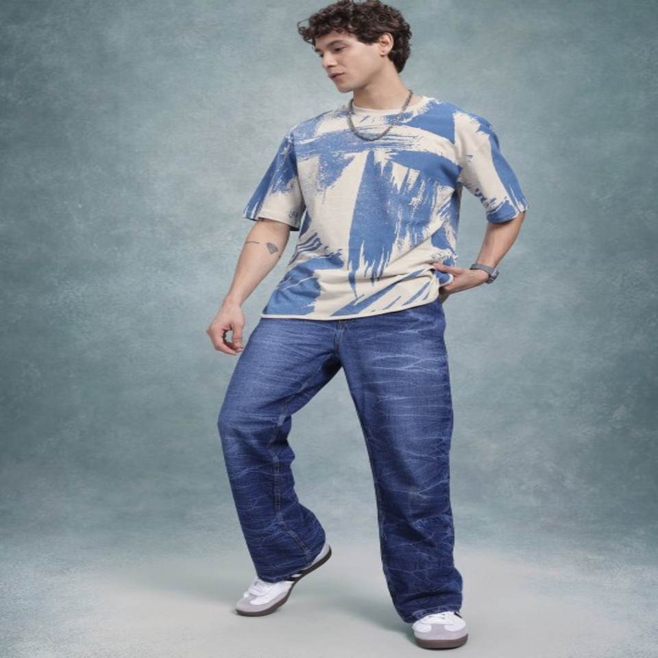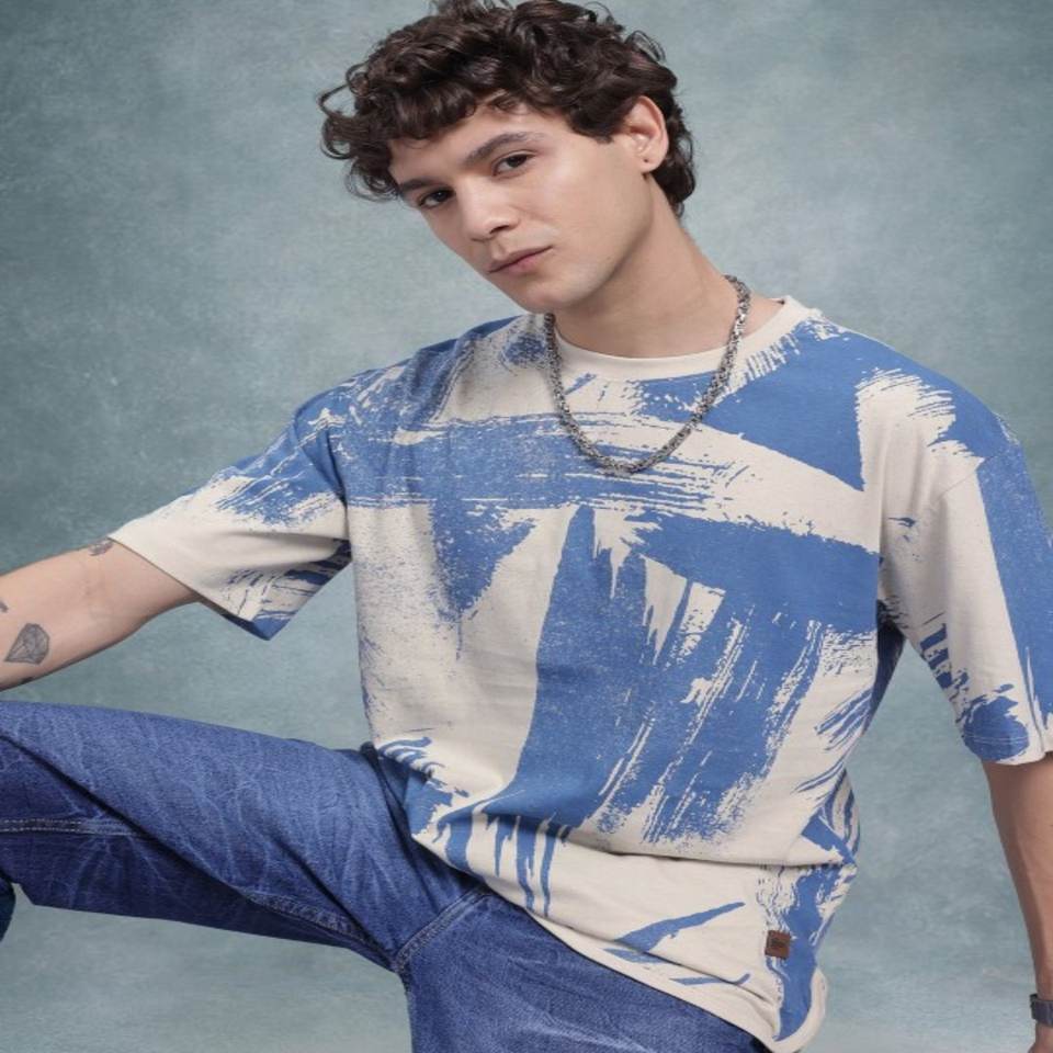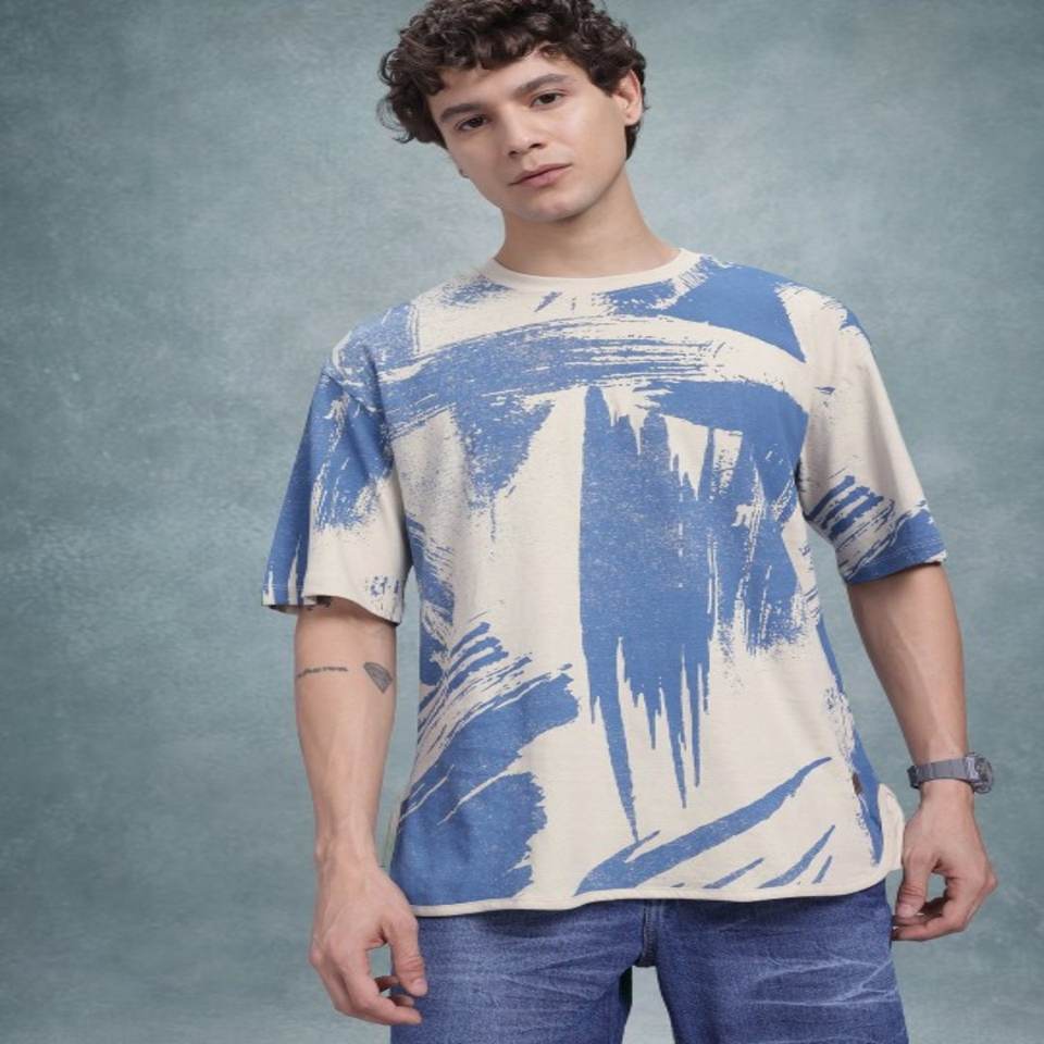 T-shirt manches courtes à épaules tombantes 100% coton Beige Bleu Imprimé abstrait Made India Plus Size Regular Length Jersey pour homme