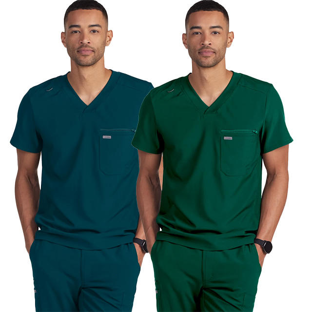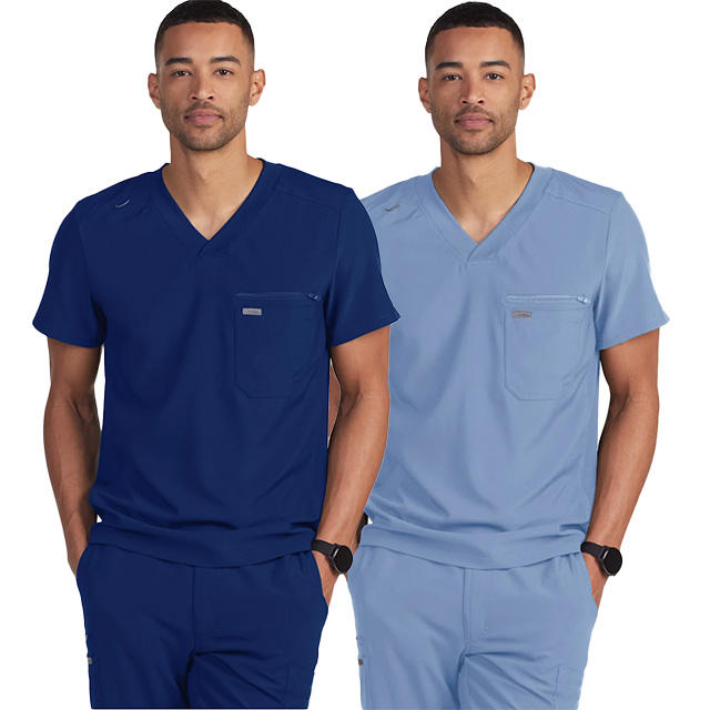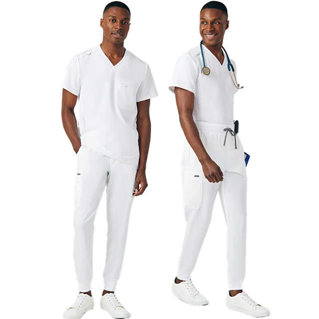 Scrubs d'infirmière à la mode de style médecin pour hommes, tissu tissé extensible à manches courtes, couleur de fond uniforme pour usage hospitalier, OEM