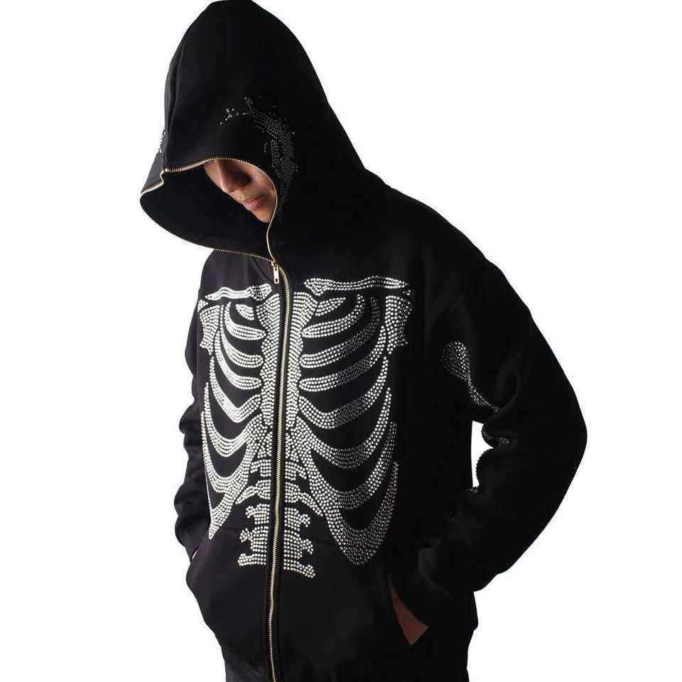 Men's Full-Face Mask Skeleton Rhinestone Zip-Up Hoodie 2026 Streetwear Y2K Black Oversized Sparkle Bone Graphic Jacket HD