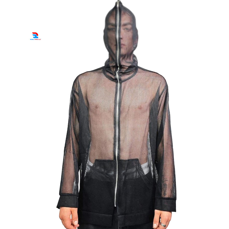 Sweat à capuche en maille transparente à fermeture éclair pour hommes, manches longues, surdimensionné, voir le haut, soirée, club, motif uni, transparent
