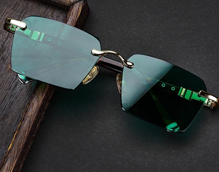 Lunettes de soleil rectangulaires haut de gamme pour hommes, sans monture, en pierre brute, avec verres dorés transparents et dégradés en nylon