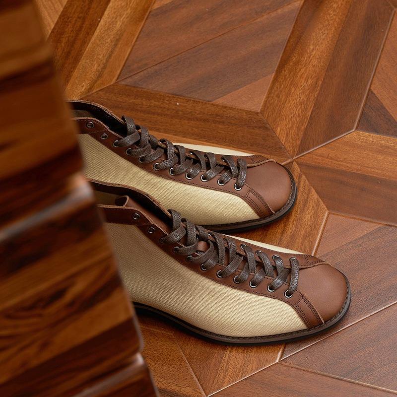 Bottes de boxe classiques montantes pour hommes, style rétro carré, color block, à lacets, tige en cuir, semelle extérieure en caoutchouc, antidérapantes et respirantes