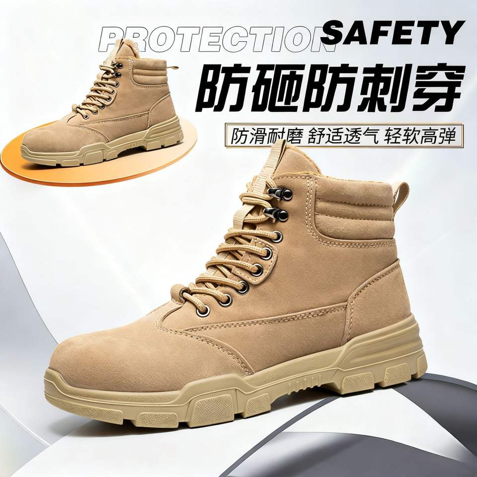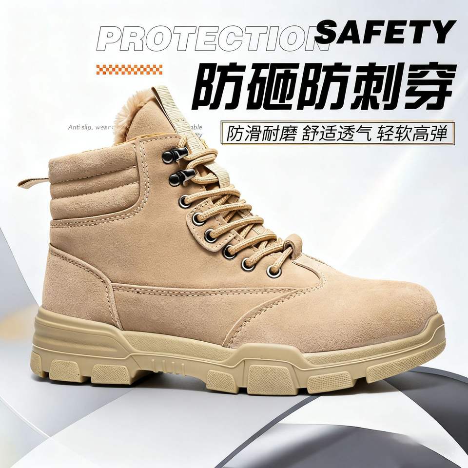 Chaussures de sécurité montantes pour hommes, à embout d'acier, antidérapantes, doublées polaire beige, pour travaux de construction et usage industriel