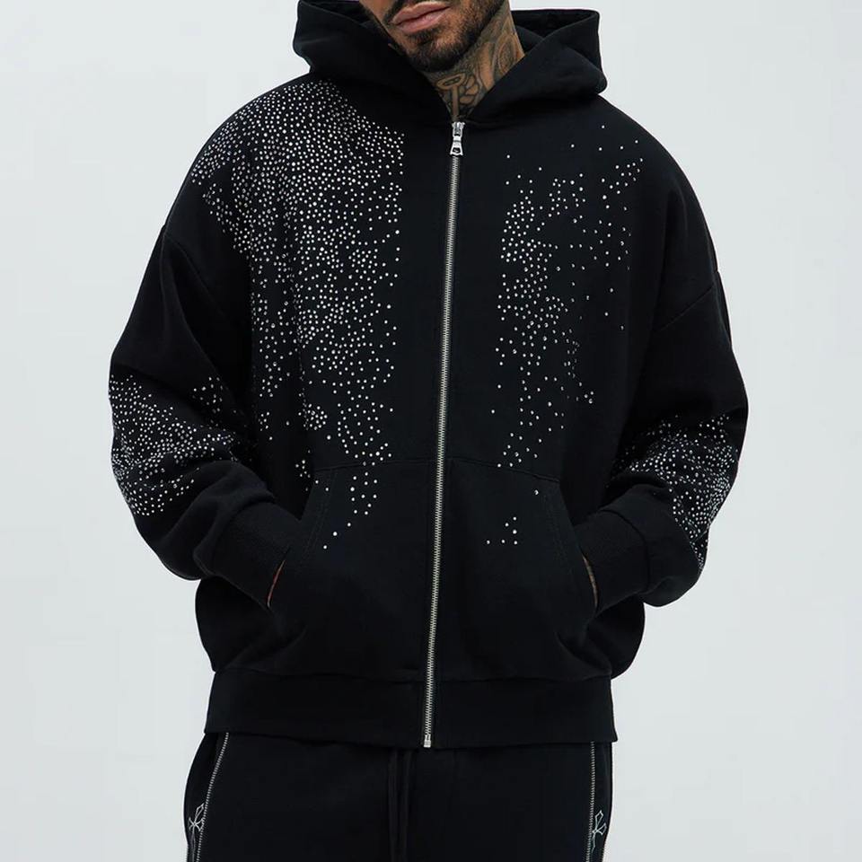 Ensemble de survêtement pour homme, sweat-shirt et pantalon de survêtement en coton 100% avec strass, ensemble délavé à l'acide, surdimensionné, fermeture éclair intégrale, poids lourd