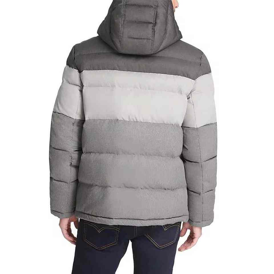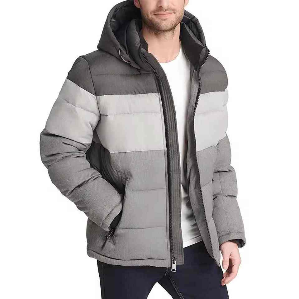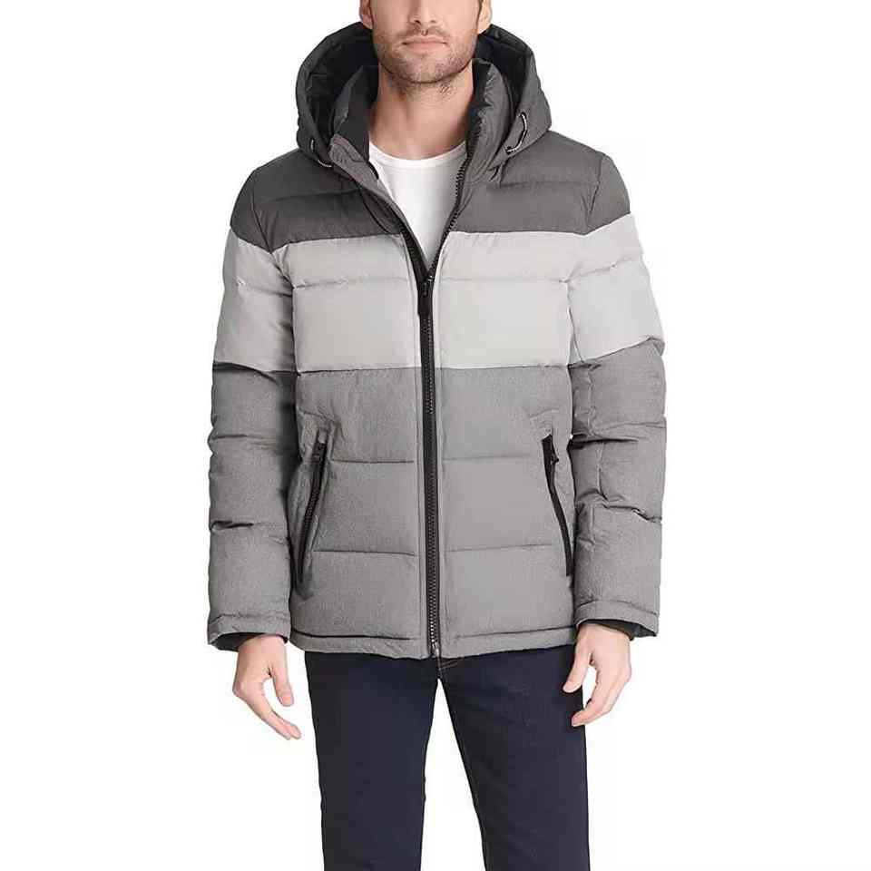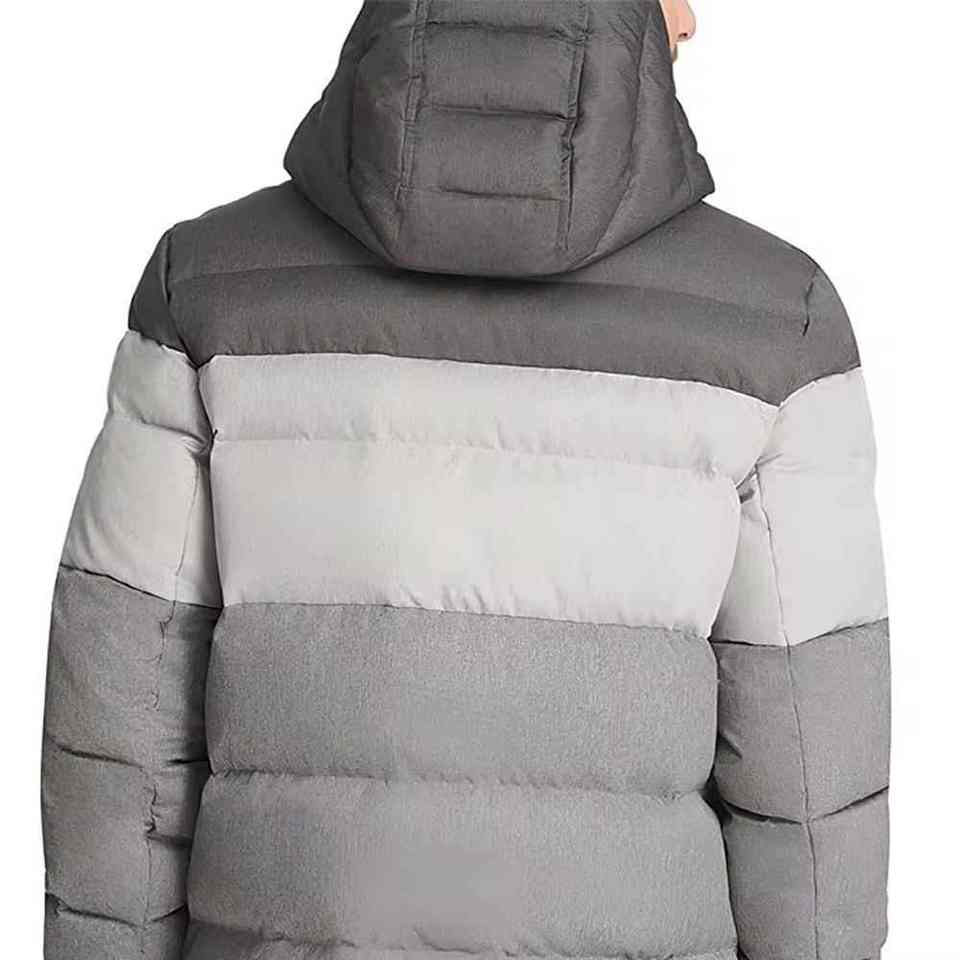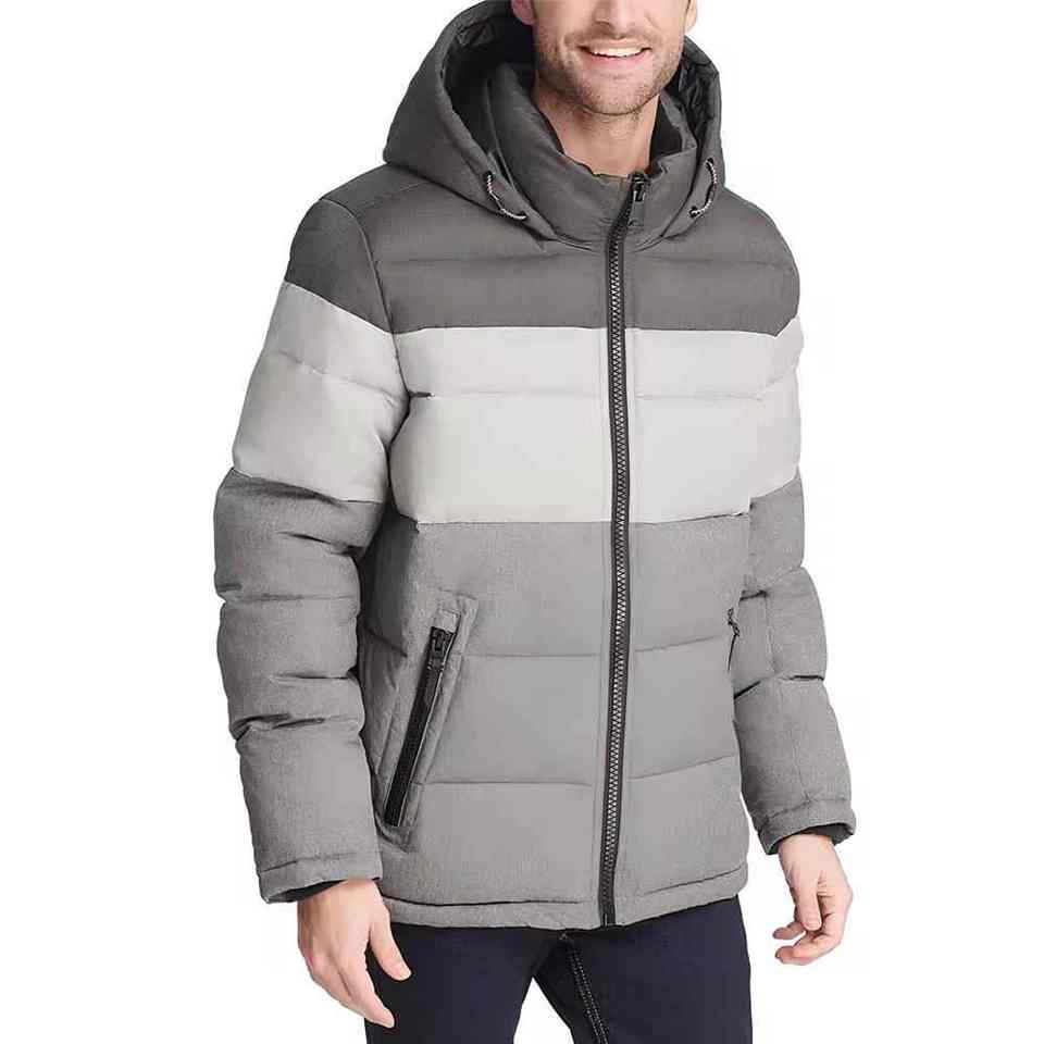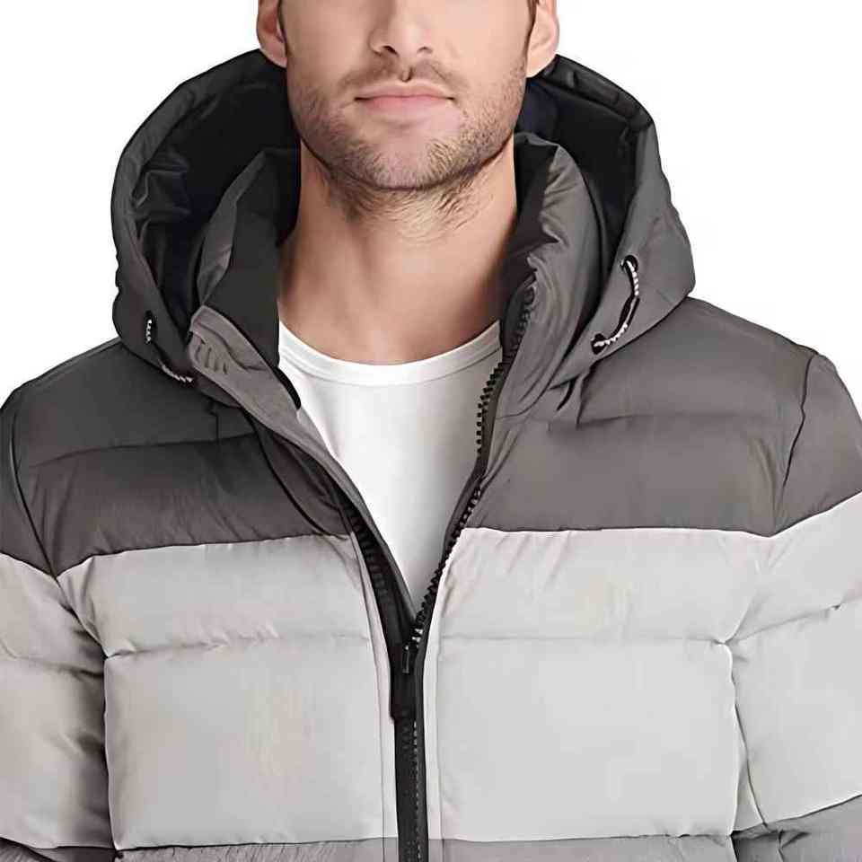 Veste longue matelassée bleue légère pour homme | Logo d'hiver à col montant et coupe-vent imperméable avec poches zippées