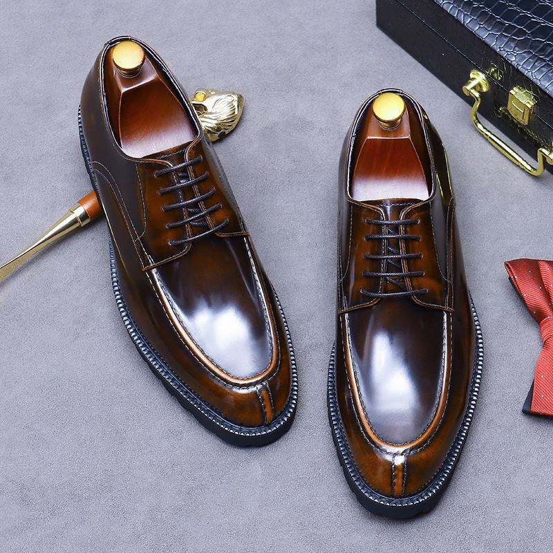 Chaussures habillées pointues en cuir brillant de luxe pour hommes, style à lacets, marron, neuves, imperméables - Idéales pour les mariages