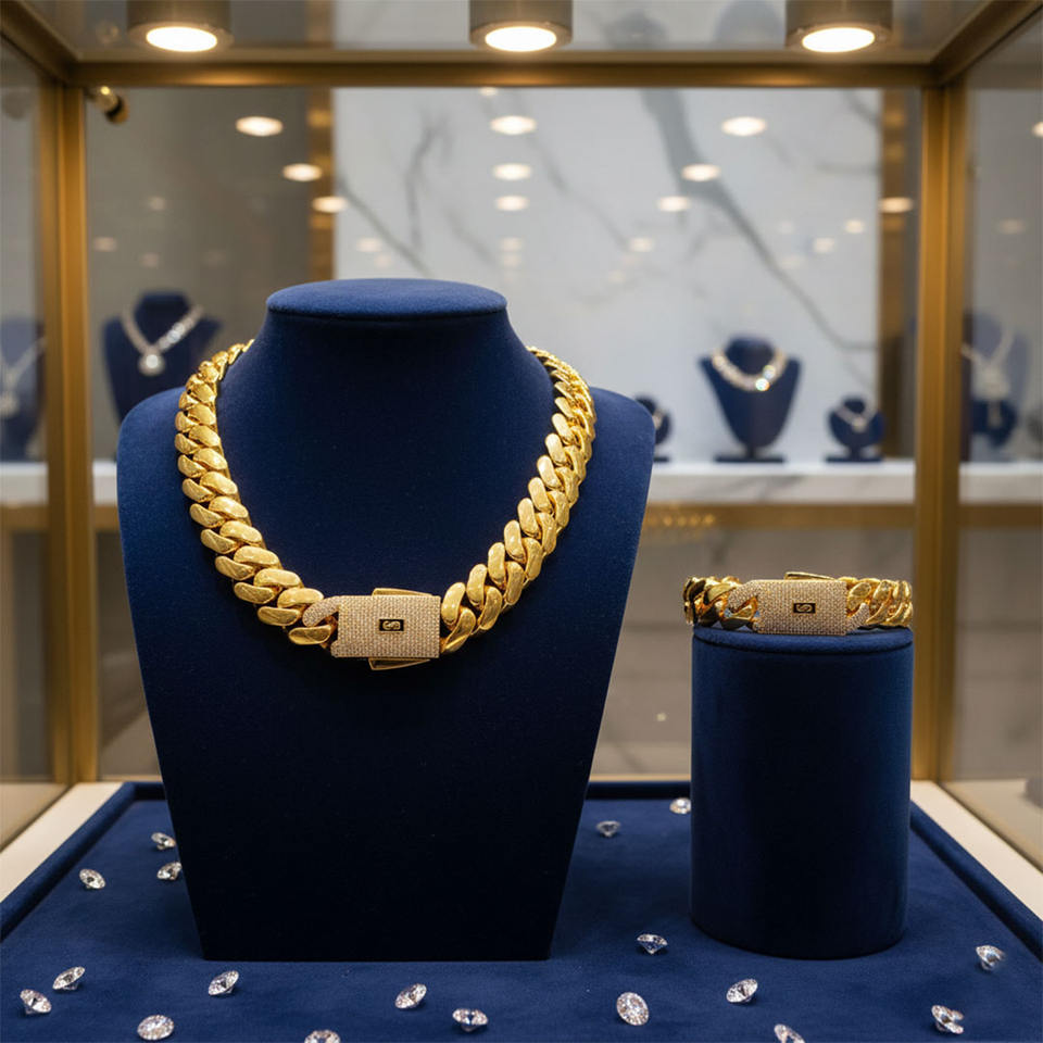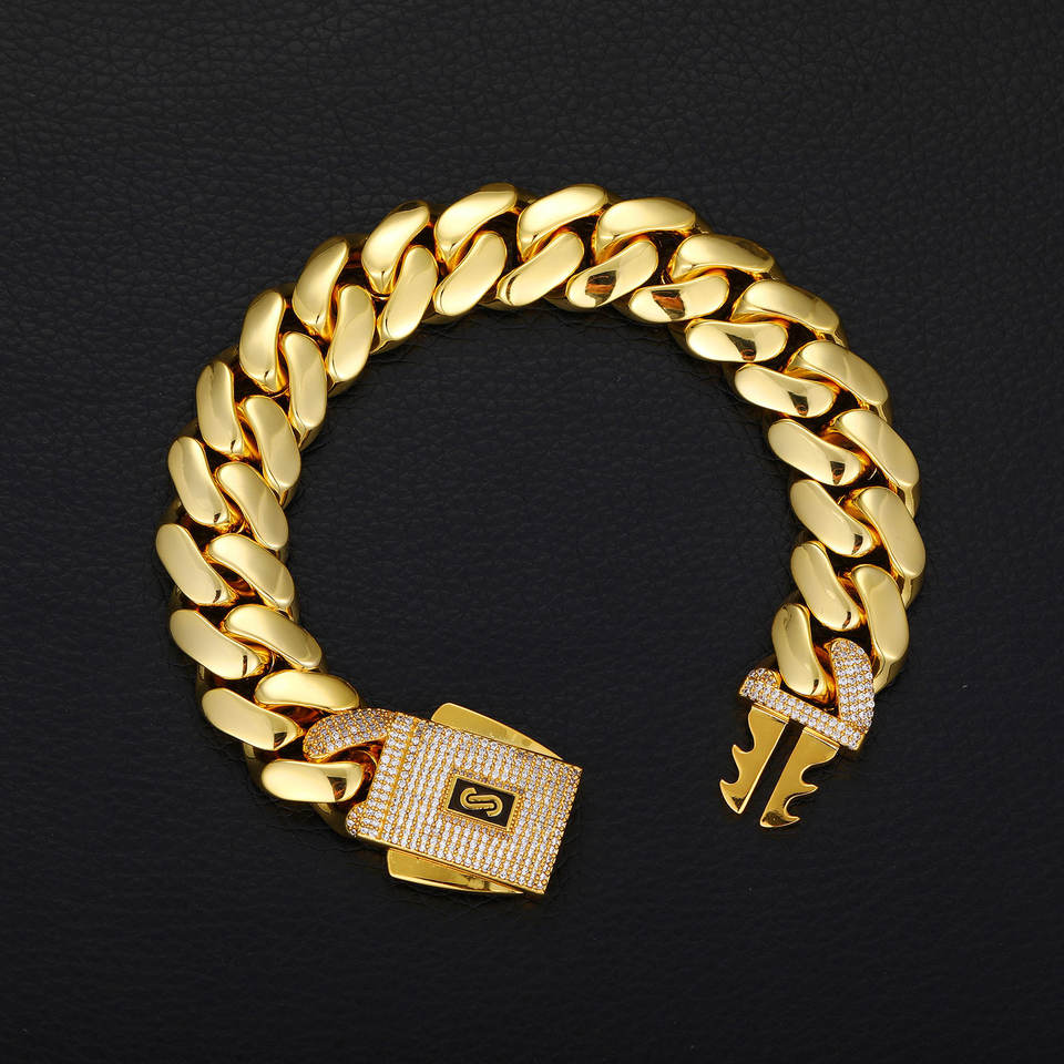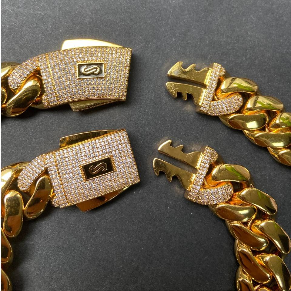 Ensemble de maillons cubains Miami pour homme avec fermoir Monaco glacé en plaqué or 14 ct 18 ct collier et bracelet en laiton lourd bijoux combinés