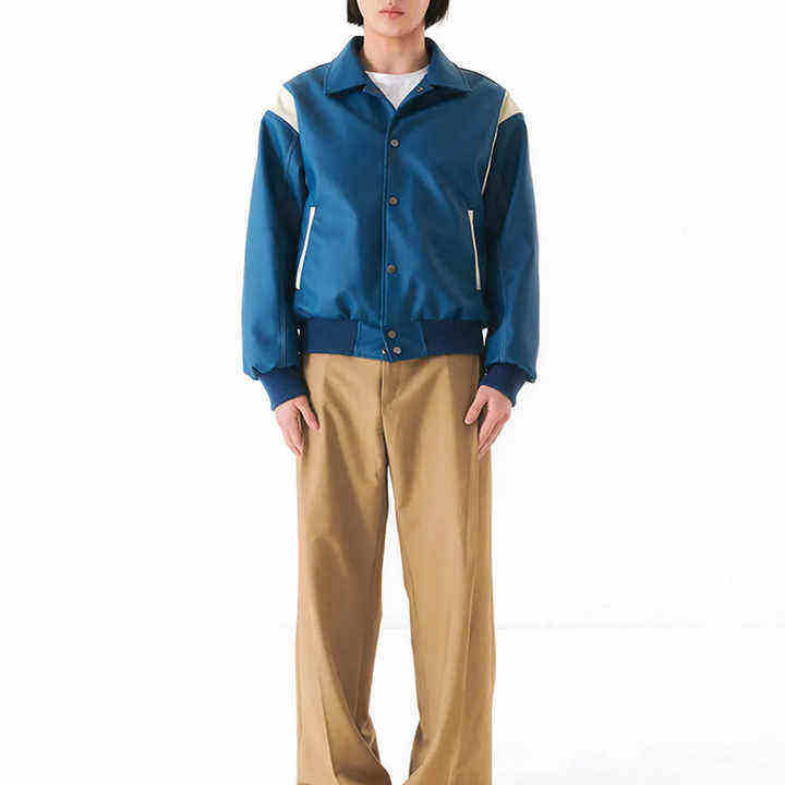 Veste universitaire surdimensionnée pour homme en cuir de vache bleu, style stade, tricotée, avec emmanchures évasées, tendance et stylée, effet brut