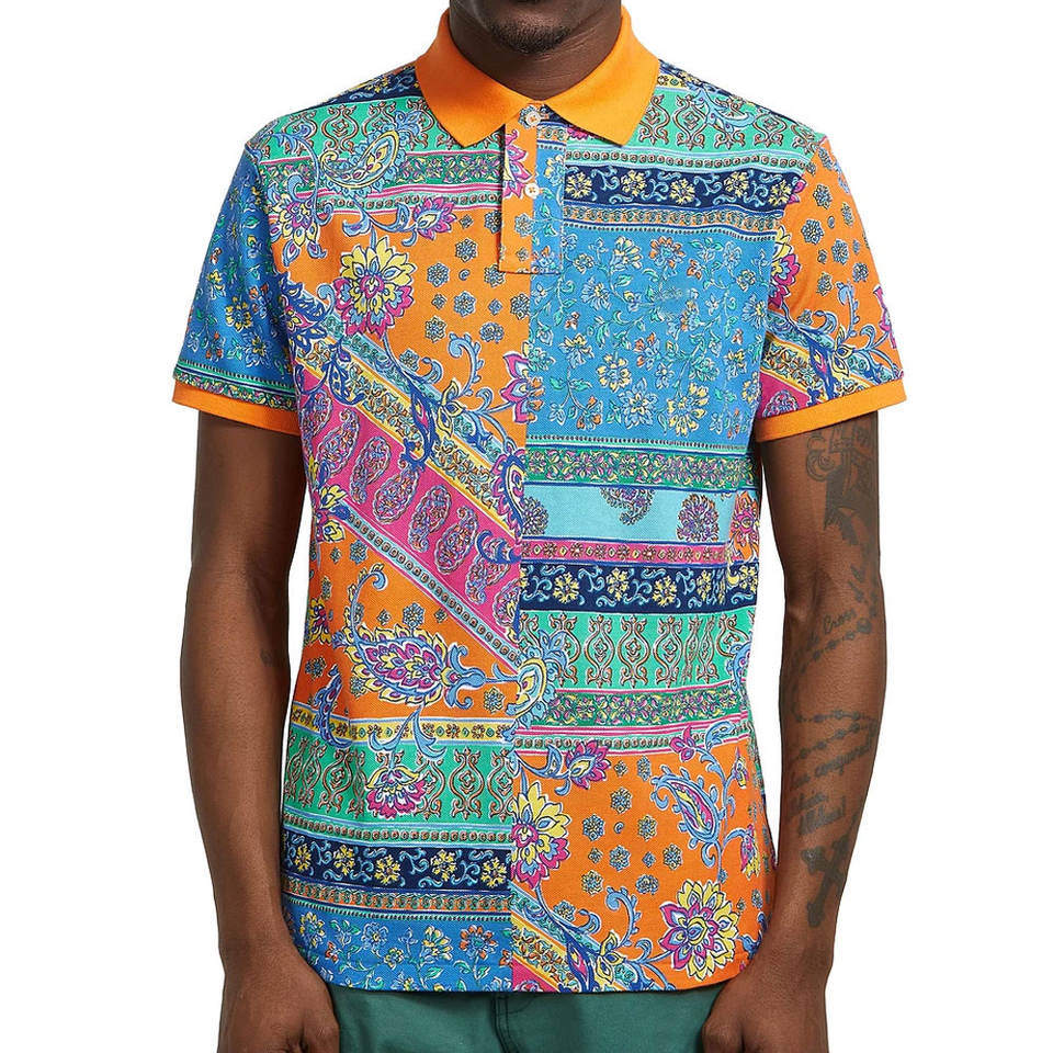 Chemise de performance pour homme | Haut de sport de luxe respirant et à séchage rapide, imprimé par sublimation, motif mosaïque paisley orange et bleu tricoté