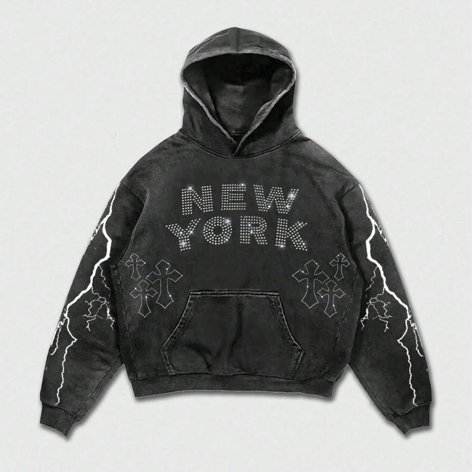 Sweat à capuche surdimensionné populaire de haute qualité avec lettres en strass et croix pour hommes-Sweat à capuche régulier à épaules tombantes pour hommes