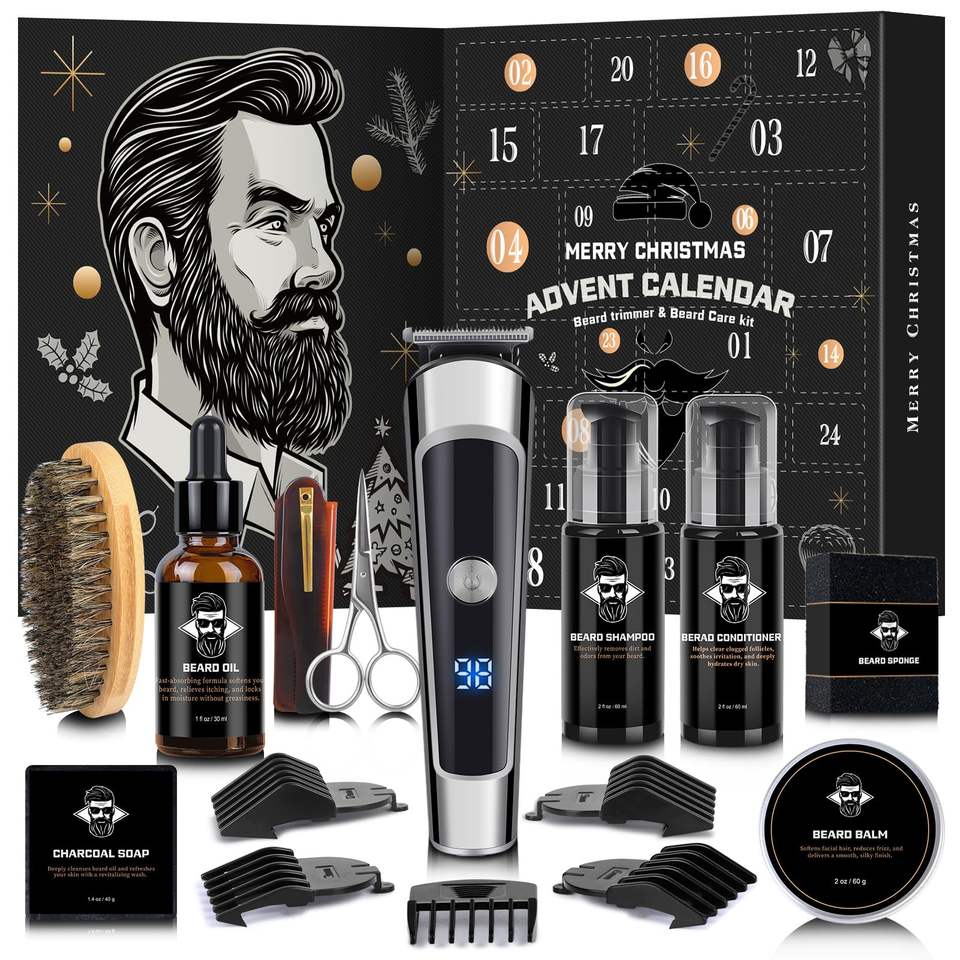 Kit de toilettage portable pour homme, calendrier de l'Avent de Noël 24 jours, comprend une tondeuse électrique pour le soin de la barbe, fabriqué en plastique durable