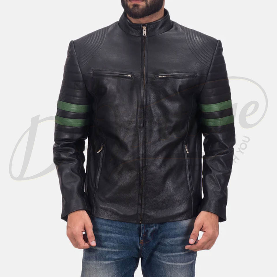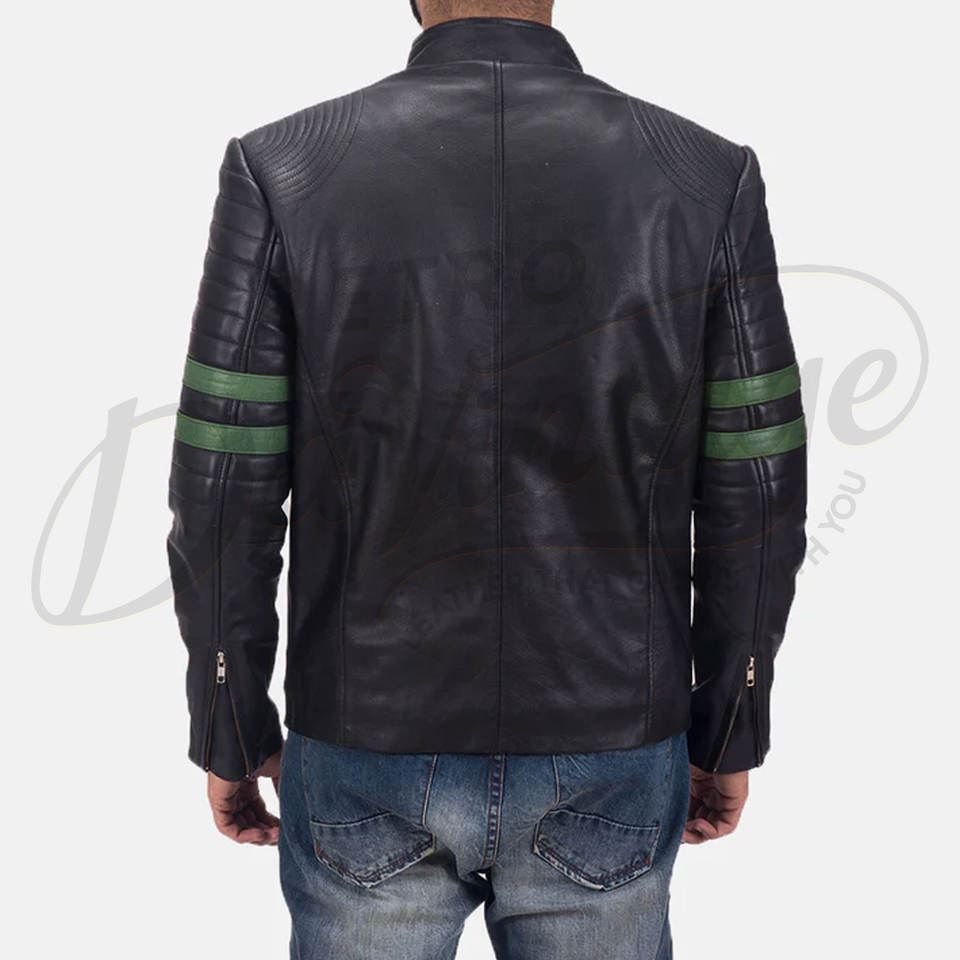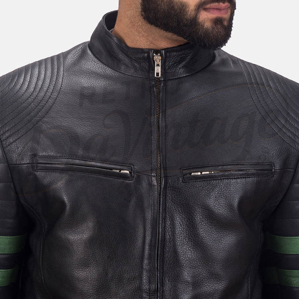 Blouson de motard en cuir noir premium pour homme, en véritable peau de mouton, coupe ajustée, avec rayures vertes, style motard, veste de mode Cafe Racer
