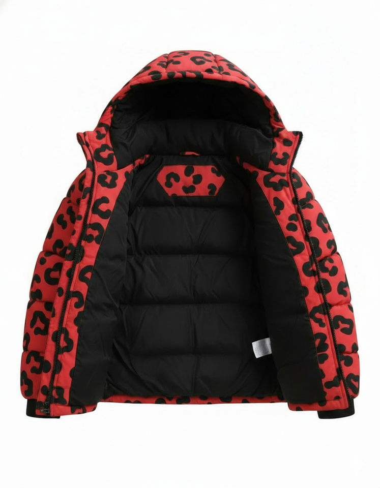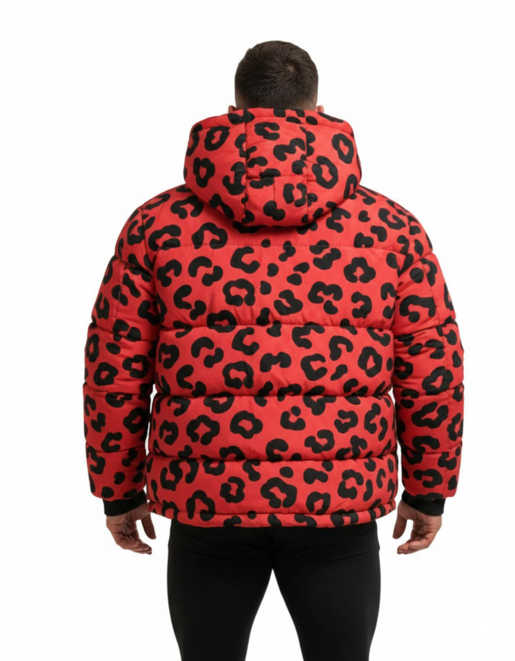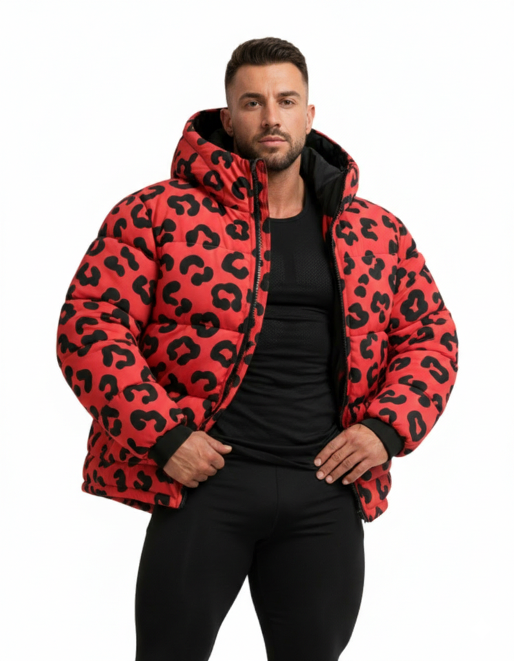 Veste matelassée à capuche pour homme, imprimé léopard rouge et noir, manteau d'hiver style streetwear, vêtement d'extérieur tendance