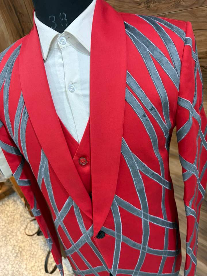 Costume de soirée rouge pour homme, de créateur, avec motif argenté – Blazer à revers châle pour marié, ensemble 3 pièces