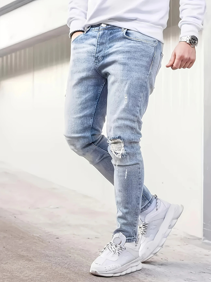 Denim stretch coupe régulière pour hommes, bleu clair, déchiré, taille moyenne dégradée, confortable, toutes saisons, adoucissant droit décontracté
