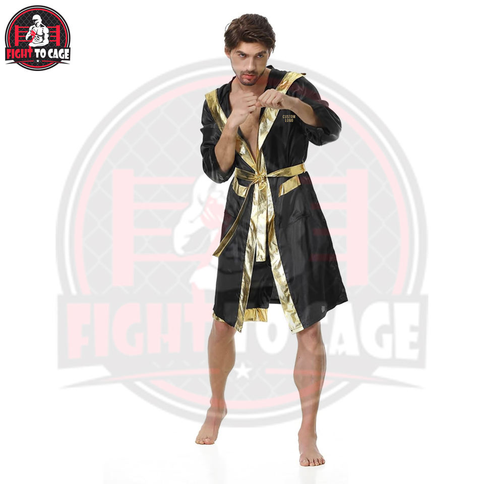 Robe de boxe noire en satin pour homme avec ceinture et capuche – Écologique et durable – Vêtement pour adulte pour les combats et l'entraînement de boxe