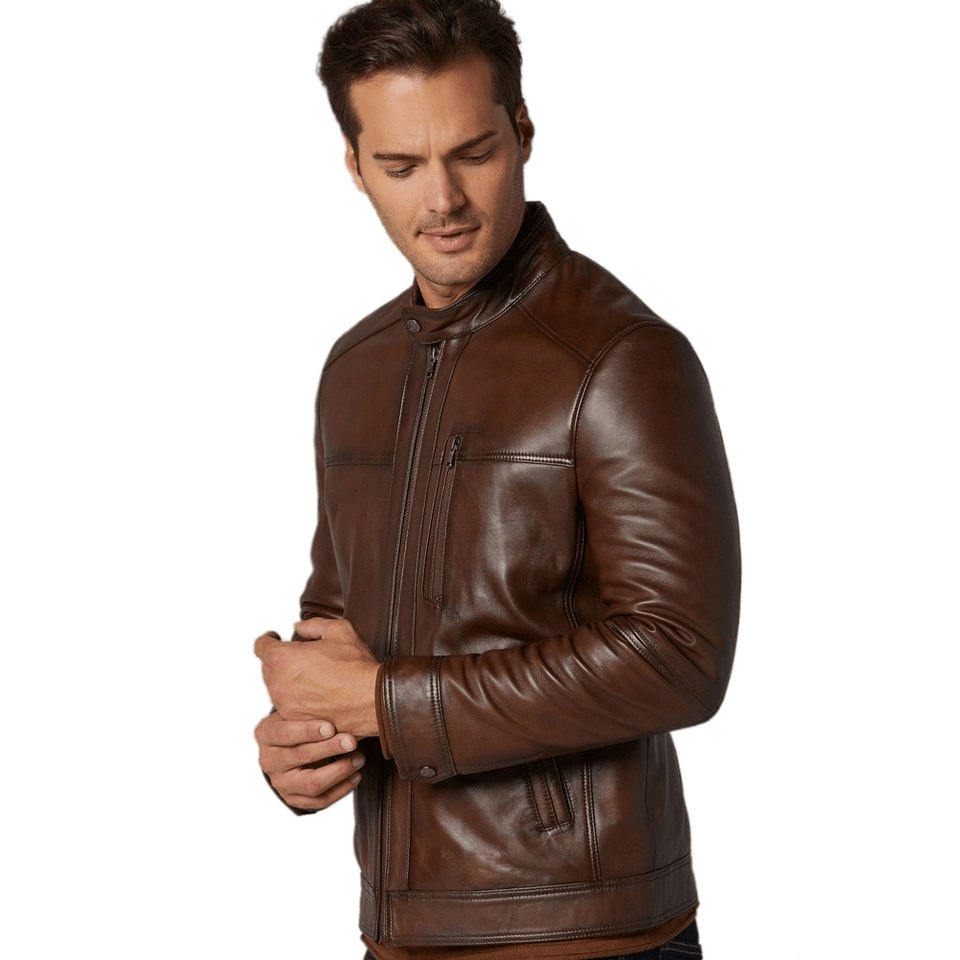 Veste d'hiver en cuir de mouton pour homme, col montant à manches longues, style motard avec fermeture éclair, haut de rue haute