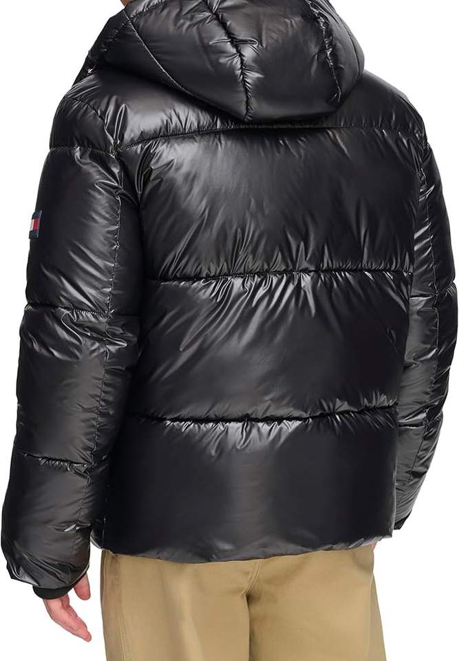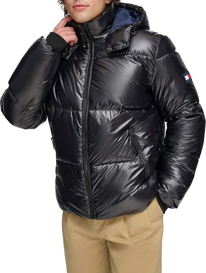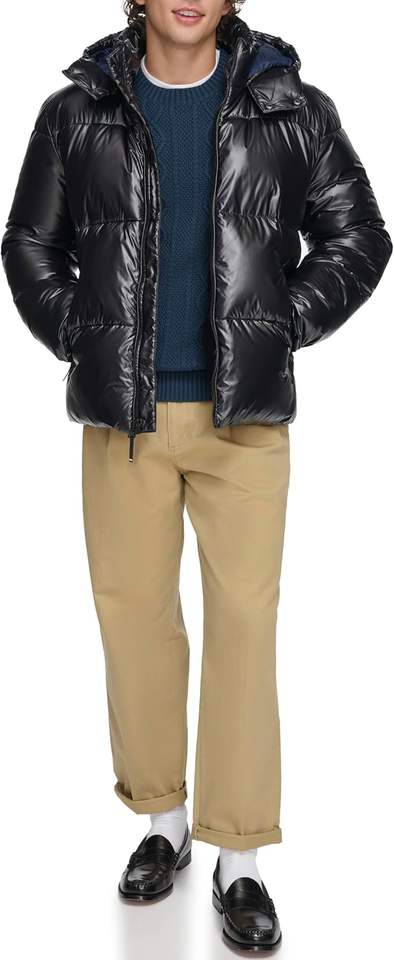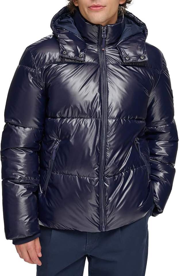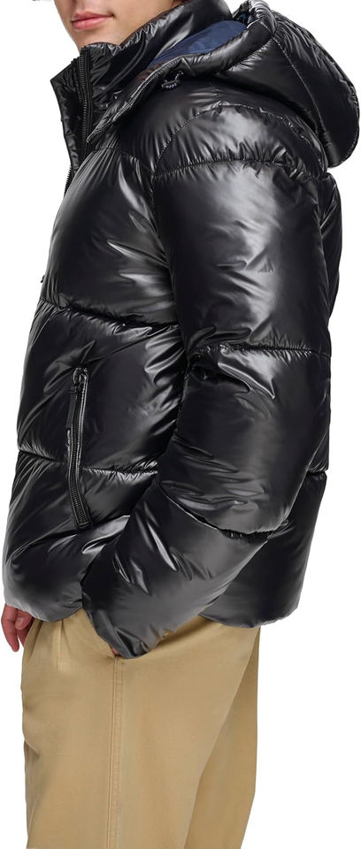 Blouson matelassé brillant pour homme avec logo brodé, poignets coupe-vent, fermeture éclair et poches zippées