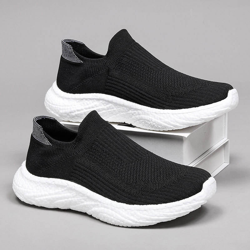 Chaussures de marche respirantes en tricot noir uni pour hommes, baskets décontractées légères à semelle épaisse en EVA antidérapante pour un usage quotidien