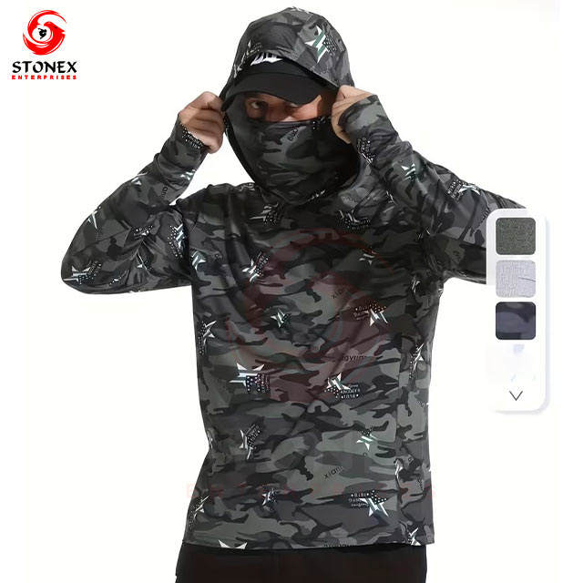 Sweat à capuche de pêche pour homme en spandex/polyester UPF 50 avec masque pour le travail en extérieur, grande taille et service OEM