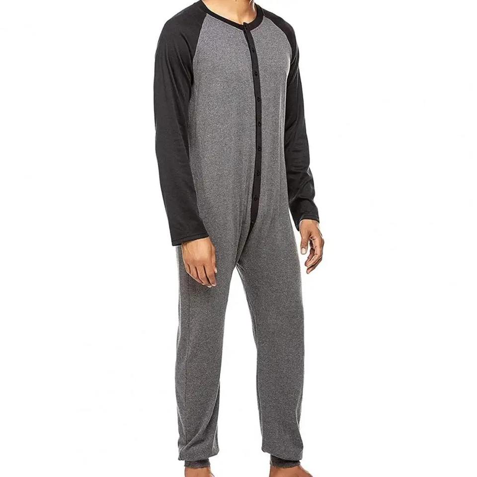 Combinaison une pièce printemps-automne pour hommes, pyjama col en O, manches longues, fermeture frontale boutonnée aux hanches, vêtements de nuit confortables, ensemble de vêtements d'intérieur