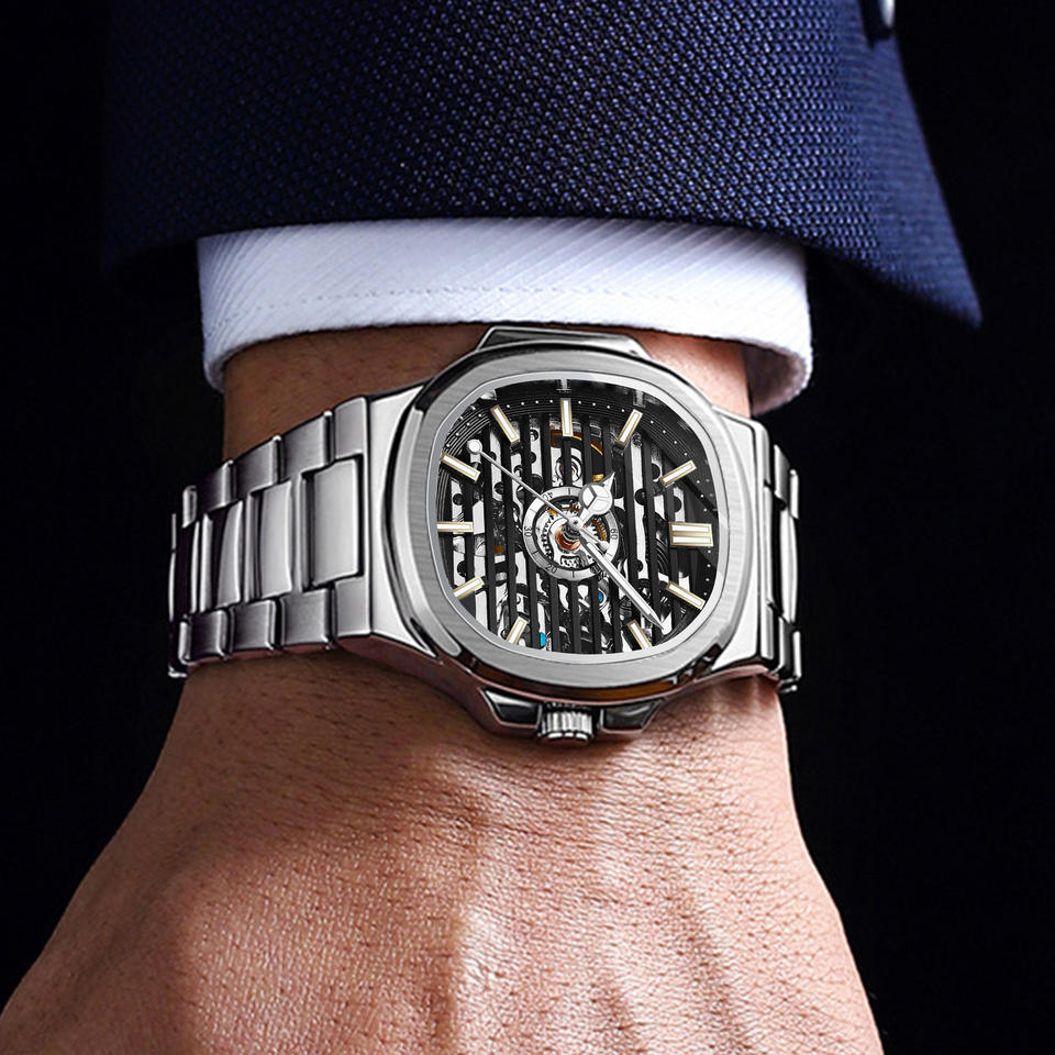 Montre mécanique pour homme à cadran carré, entièrement automatique, lumineuse, sportive, résistante à l'eau 3 ATM, squelette, bracelet en acier inoxydable, style affaires