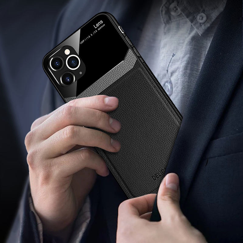 Étui en cuir PU pour iPhone 16, 15, 14, 13, 12, 11 Pro Max, étui de luxe en cuir trempé avec motif en verre trempé pour hommes