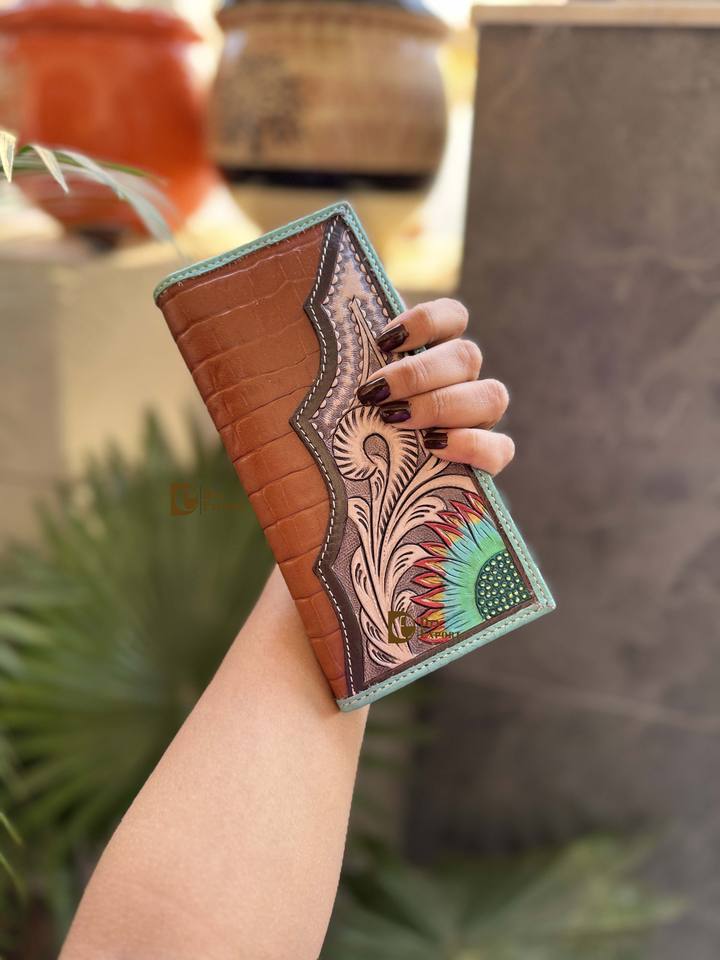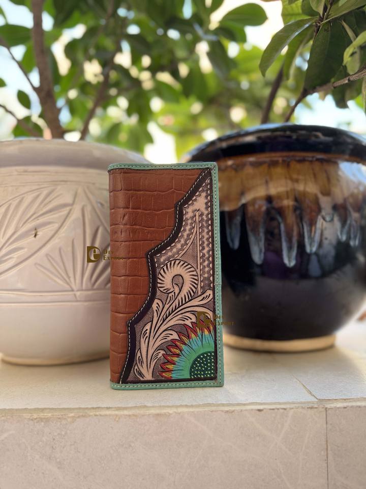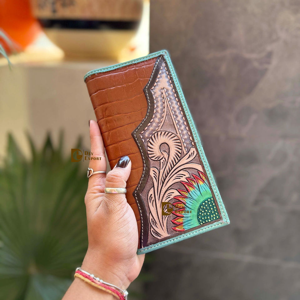 Portefeuille long élégant pour homme en nylon turquoise style western avec doublure, protection RFID, gravure artisanale, porte-billets, vente chaude, cadeau tendance pour lui
