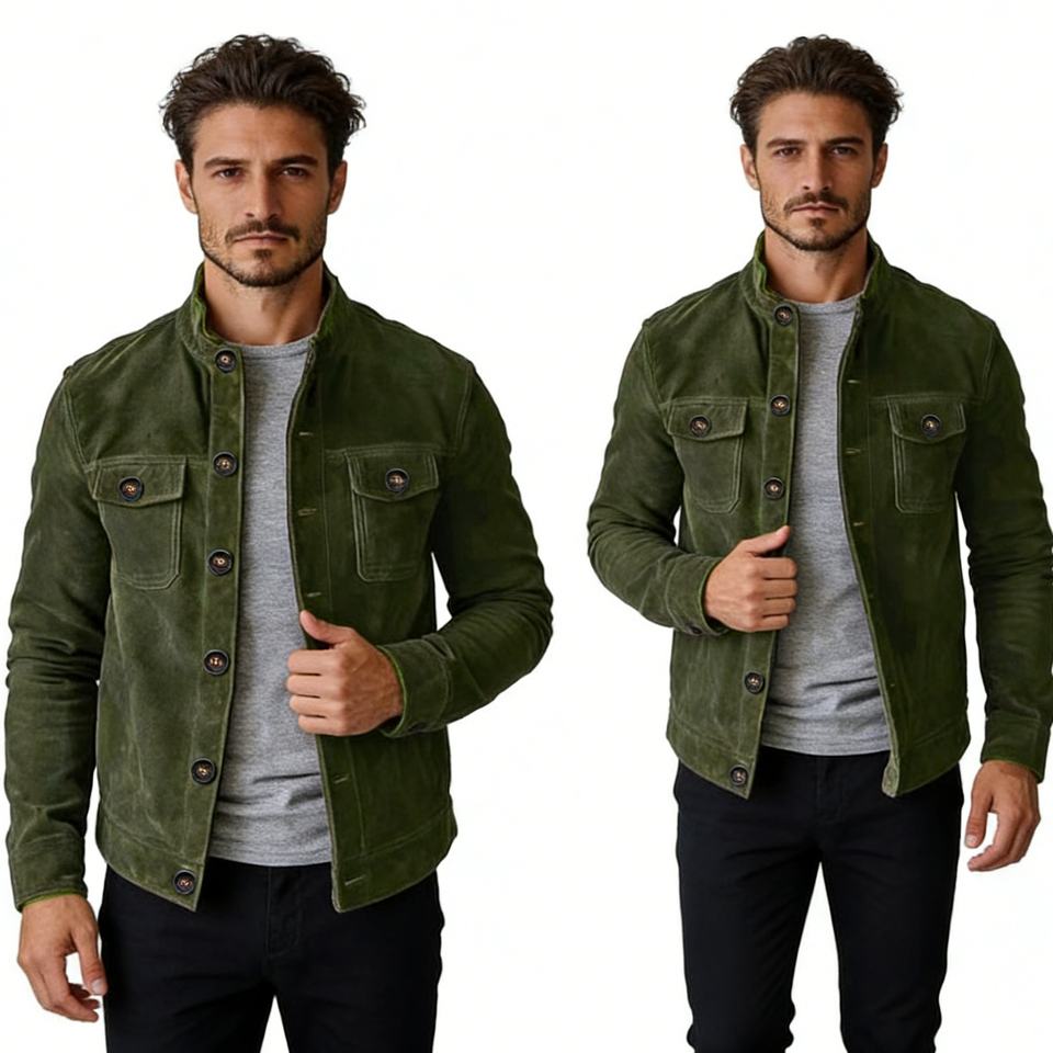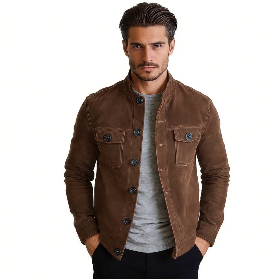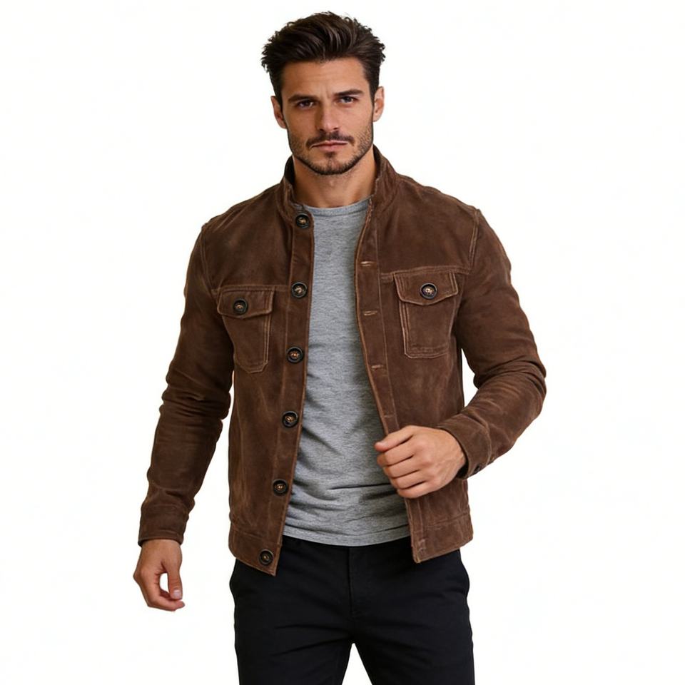 Veste boutonnée en daim pour homme, col montant, décontractée, avec poches poitrine et détails boutons vintage, Sehe Fashion