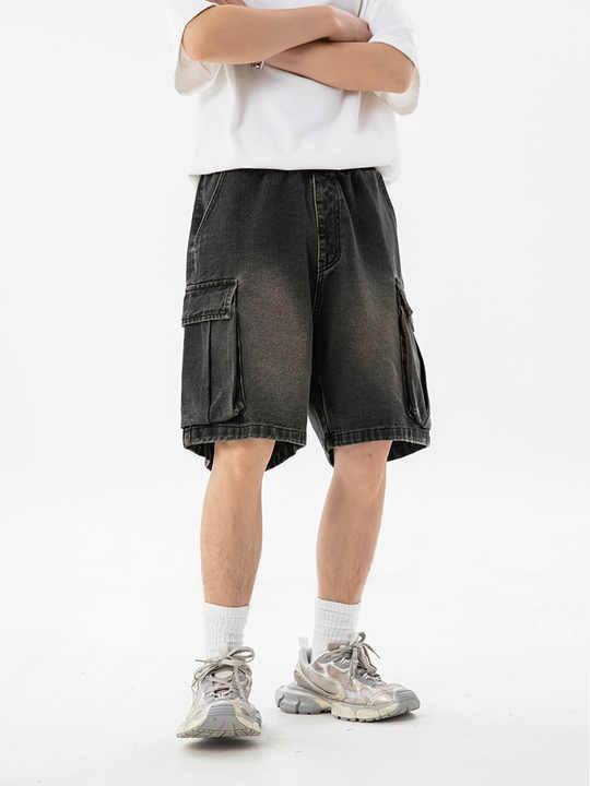 Men's Summer Casual Breathable Knitted Washed Denim Shorts Large Stereoscopic Pocket Embroidery Loose Side Light Wash