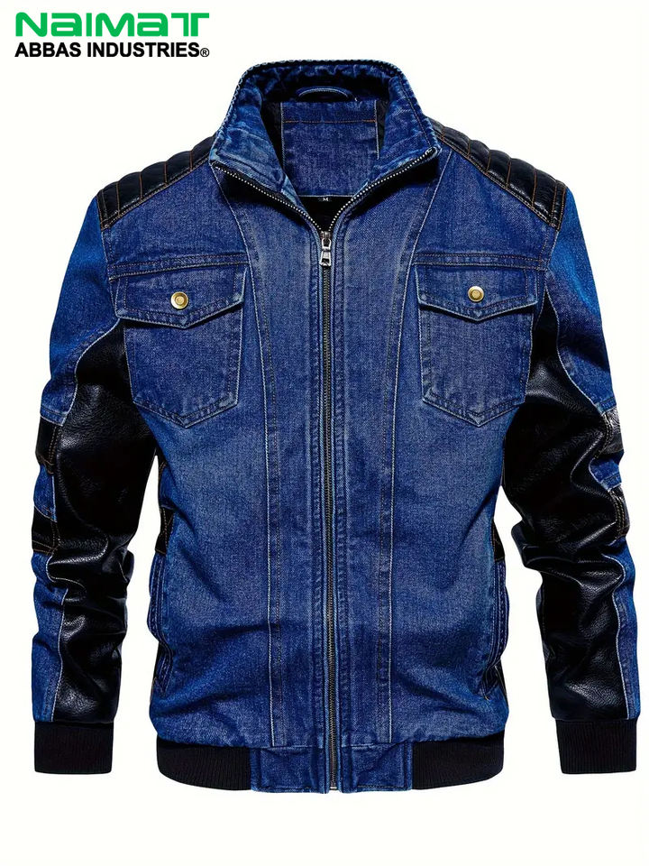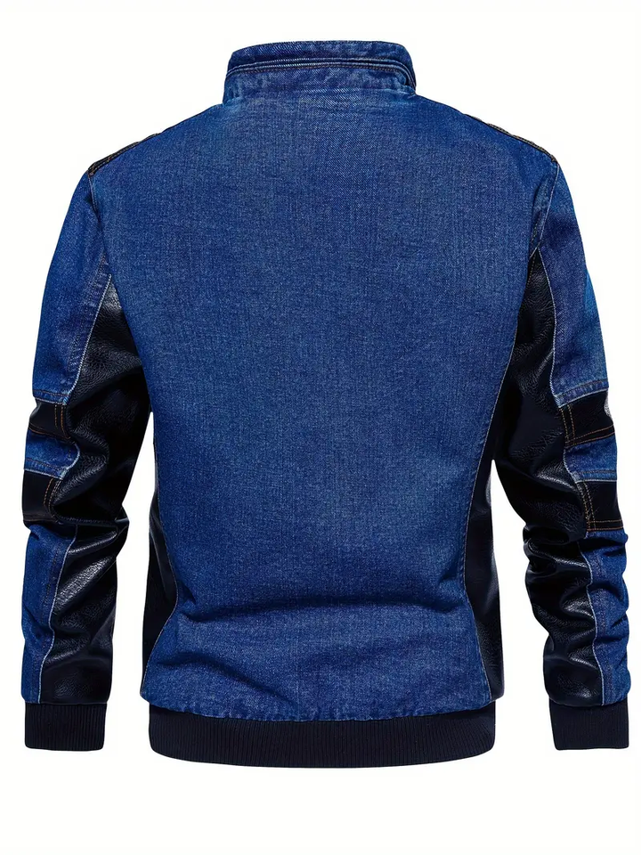 Veste streetwear tendance pour homme en denim et cuir patchwork, fermeture éclair, coupe slim décontractée, vêtement d'extérieur pour la mode