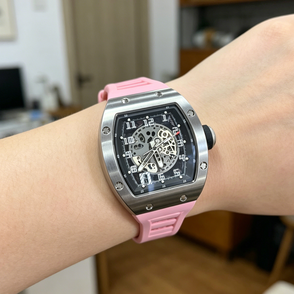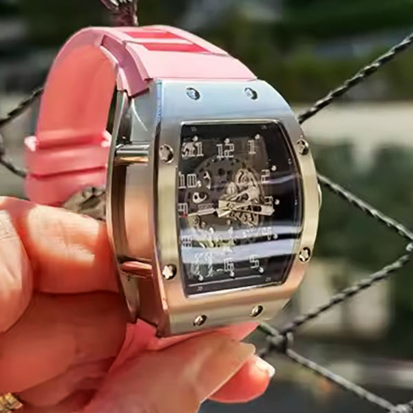 Montre mécanique automatique squelette tonneau pour homme, bracelet en silicone rose, montre-bracelet de sport de luxe, montre étanche en gros