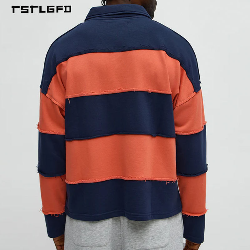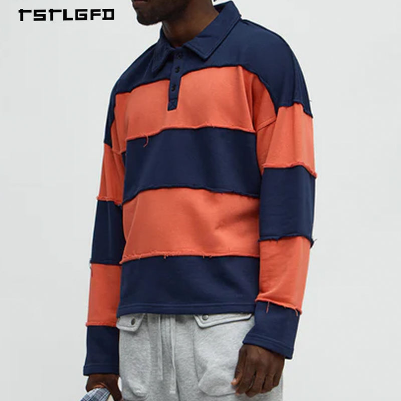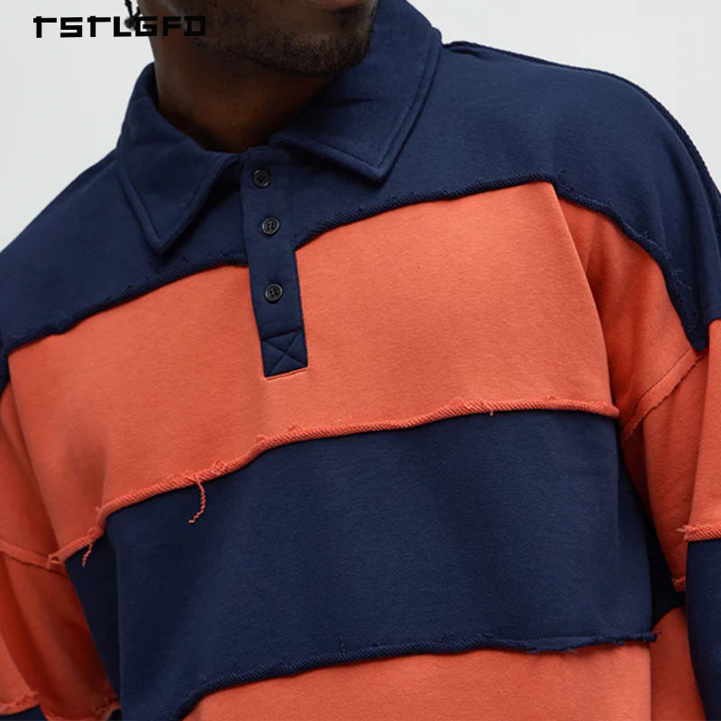 T-shirt Homme Rétro Effet Vieilli Bords Bruts Manches Longues Colorblock Épaules Tombantes Polo Rugby Streetwear Haut de Gamme