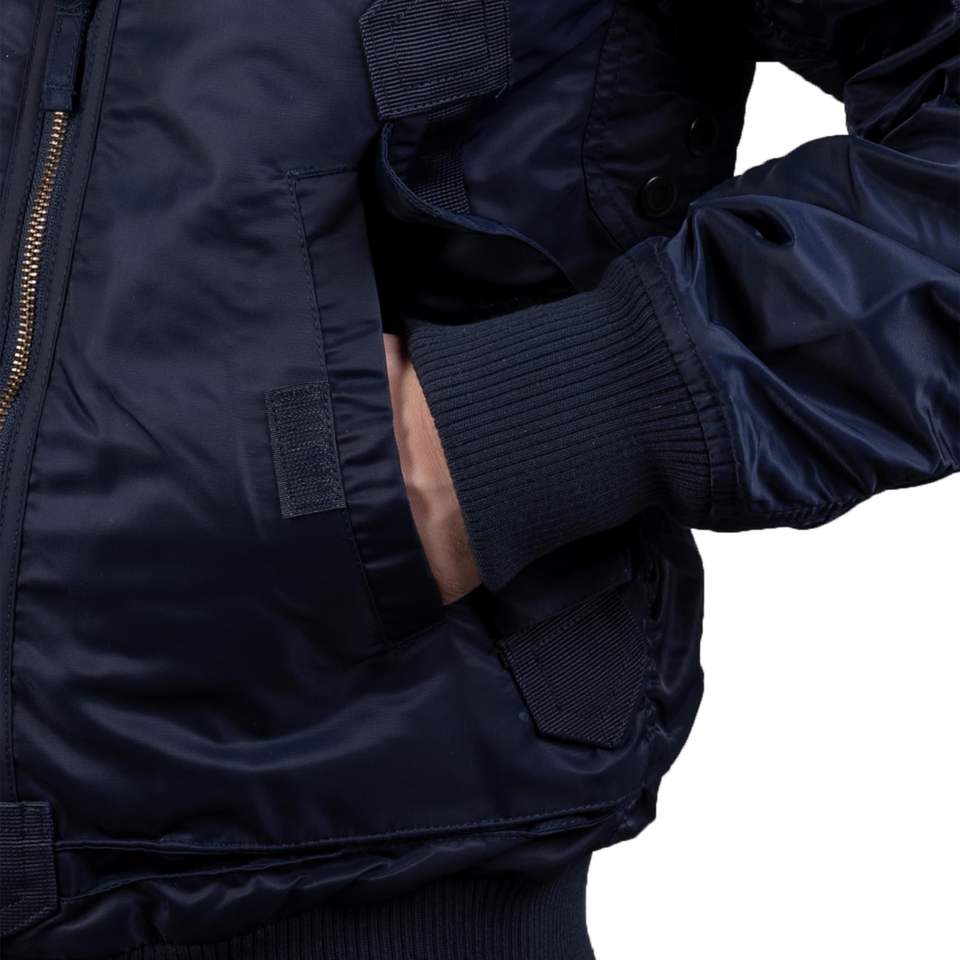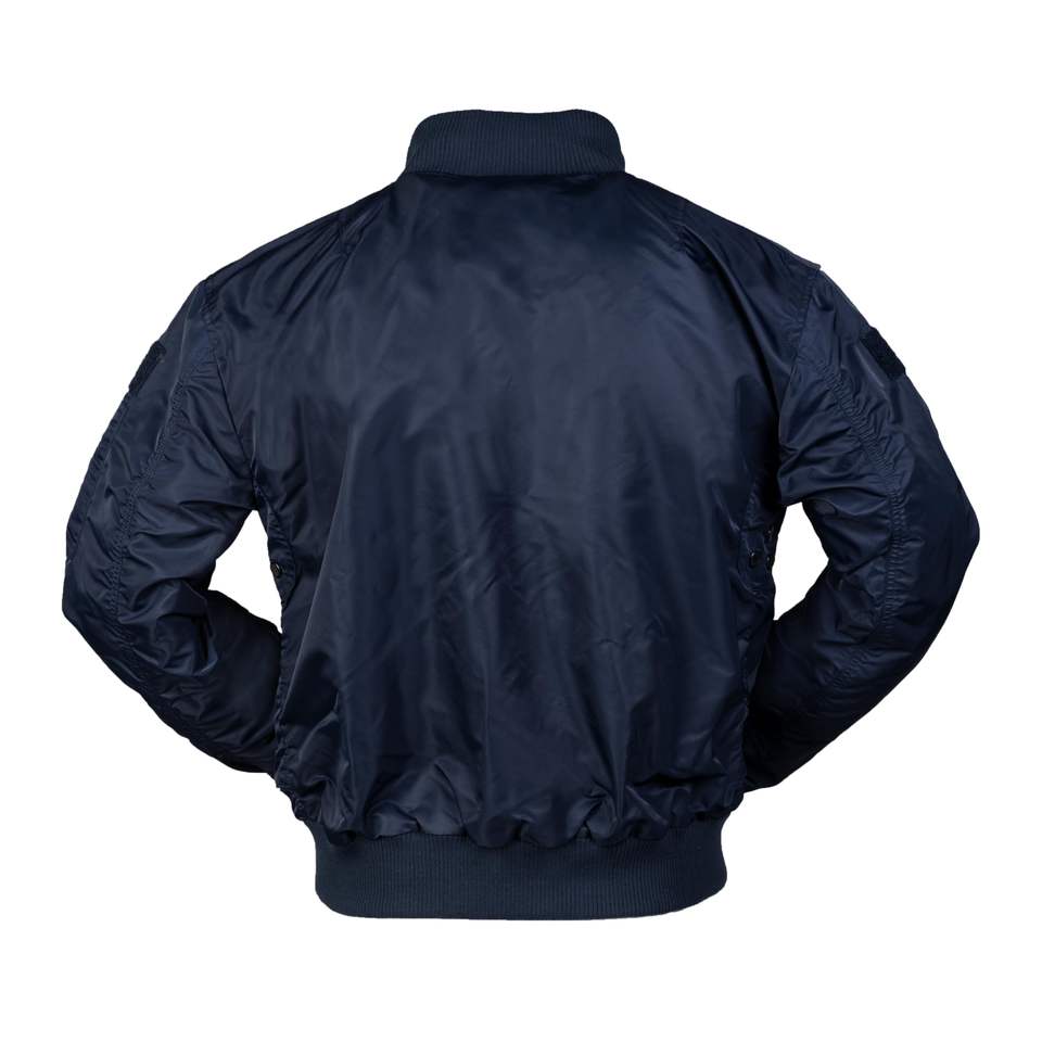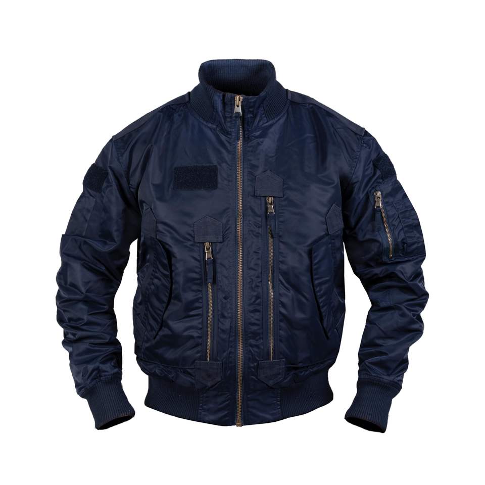 Blouson de vol tactique pour homme, bleu foncé et noir, avec boucle de suspension, bordure tricotée sur le col, les manches et l'ourlet, col montant