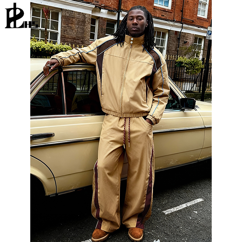 Vêtements pour hommes | Ensemble Sportif Rétro Fonctionnel - Nouvelle Collection Automne 25 : Veste de Course Américaine et Pantalon Décontracté Large Imprimé Léopard