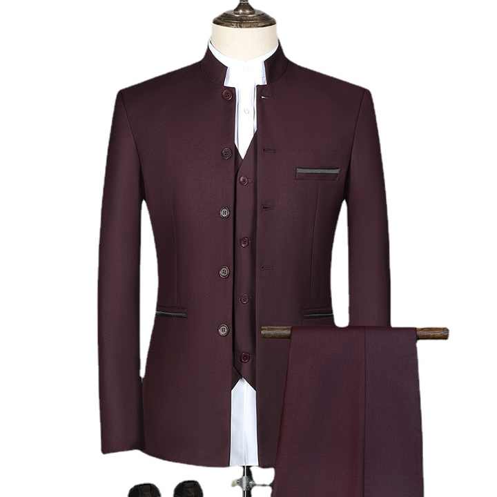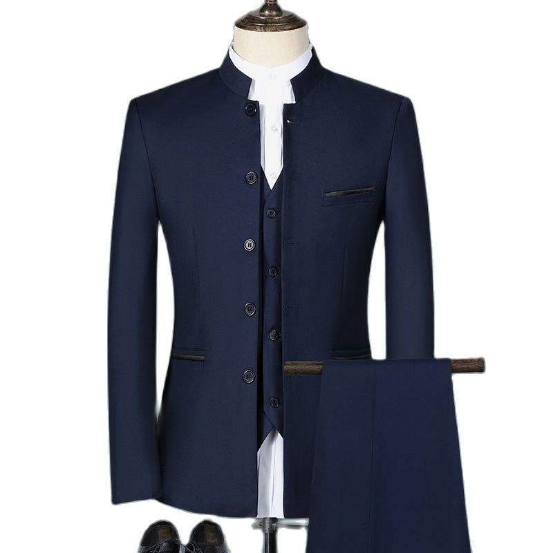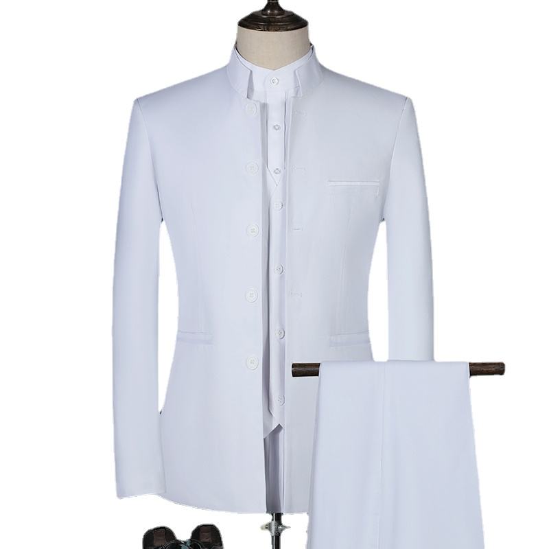 Costume d'affaires 3 pièces blanc coupe ajustée pour homme, plissé sur le devant et col montant, imperméable, style chinois