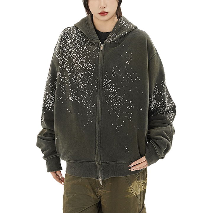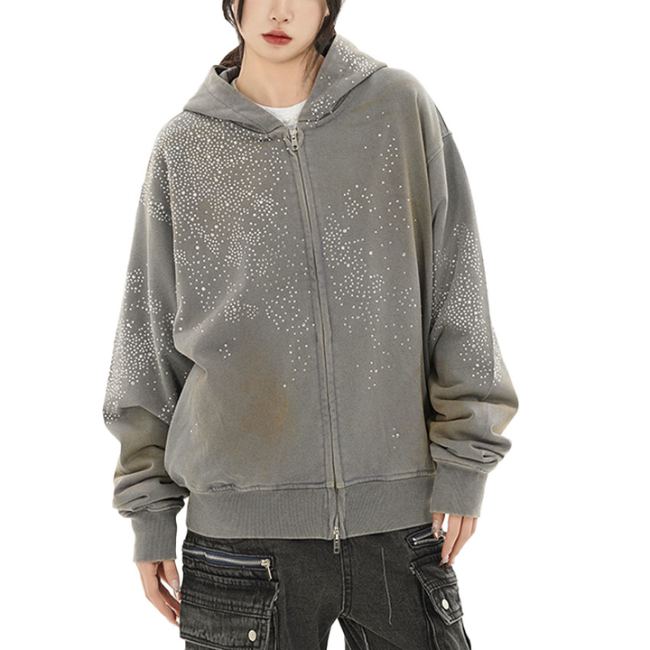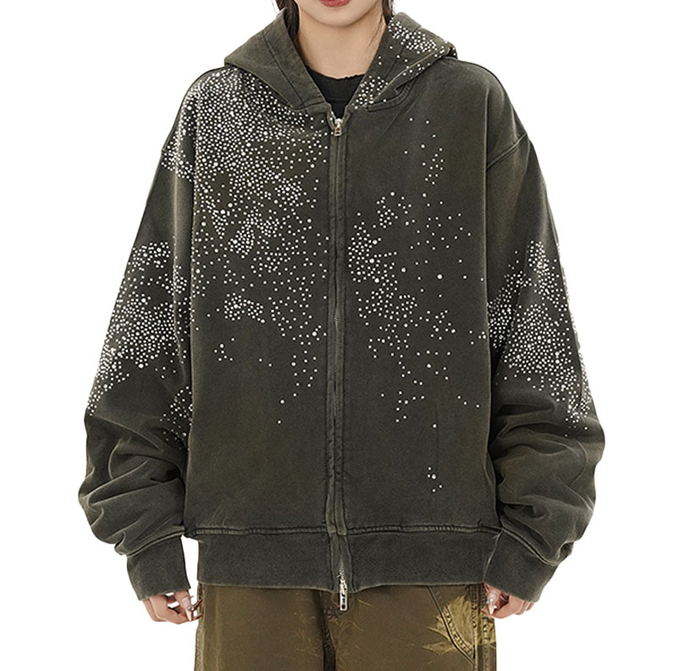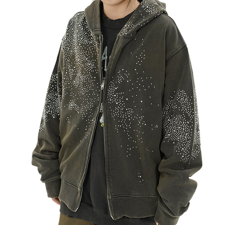 Blouson Streetwear Zippé à Capuche Unisexe Entièrement Orné de Cristaux Étoilés 2026 Noir Blanc Gris Coupe Oversize Boxy Scintillant HD