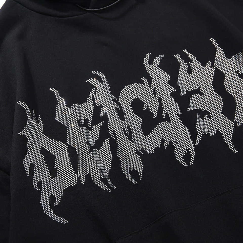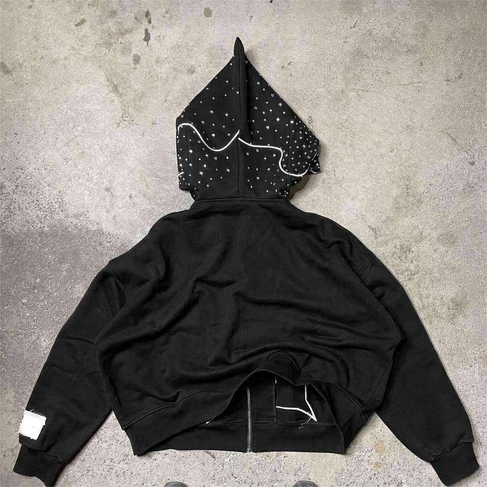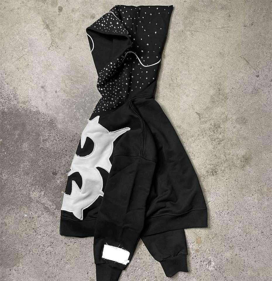 Blouson Streetwear Unisexe Noir 2026 à Capuche Entièrement Zippé, Style Gothique avec Strass, Motif Étoilé et Cristaux Scintillants, Coupe Oversize HD
