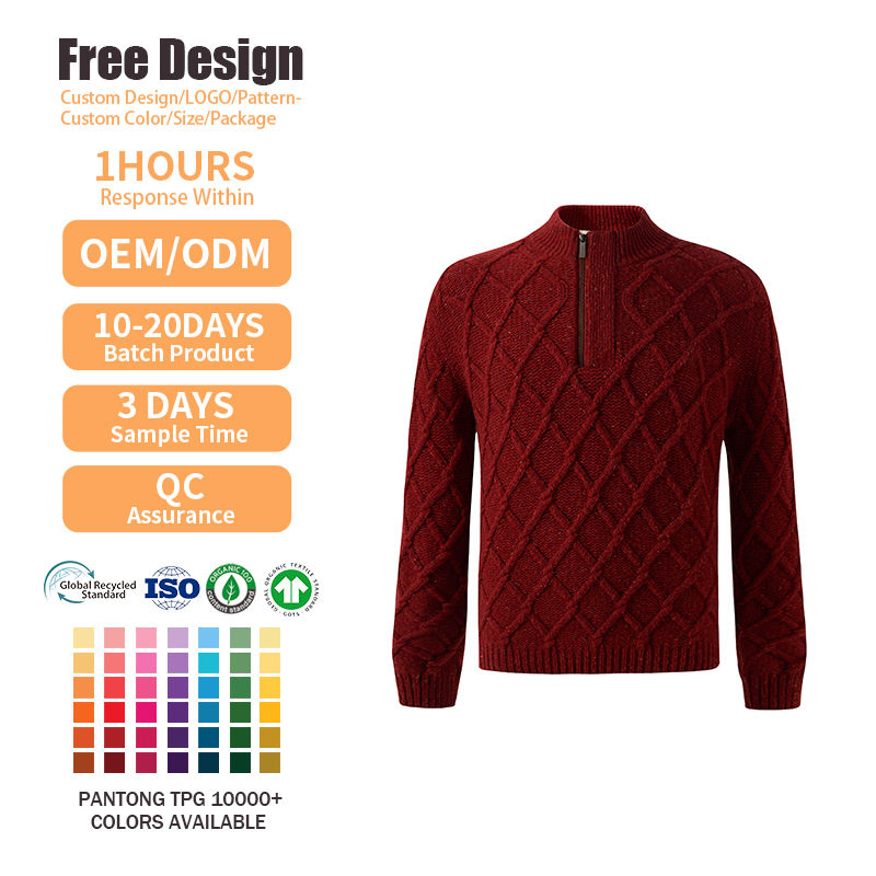 Pull en laine pour homme, motif logo brodé ODM, style ample vintage, tricot respirant, col zippé quart, idéal pour l'hiver