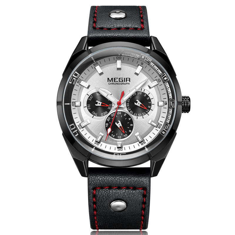 Men's watch with calendar and day of the week, genuine leather dial, quartz wristwatch