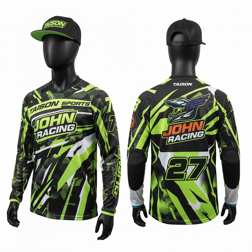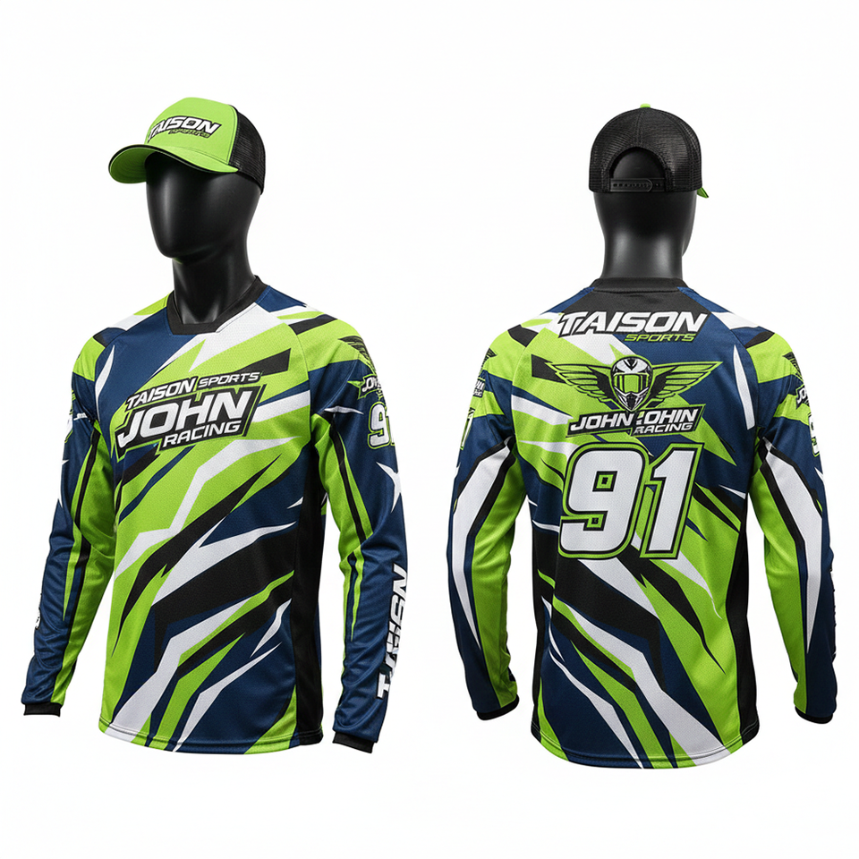 Maillot de course BMX pour hommes, 180 GSM, maille polyester respirante, vert fluo, bleu marine, design à panneaux blancs, sublimation, logo personnalisé