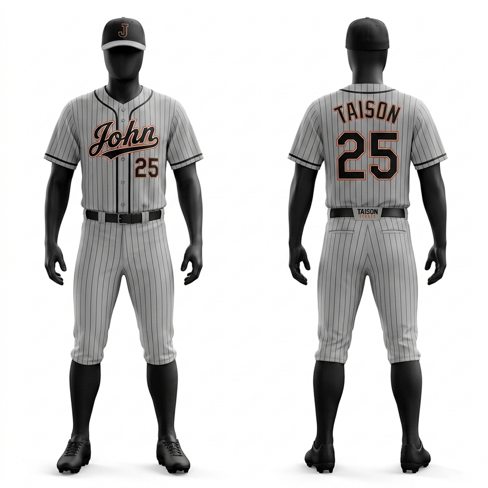 Uniforme d'équipe de baseball pour hommes, pantalon en jersey gris et noir à rayures fines, en polyester GSM Performance Mesh, avec logo brodé personnalisé en twill.
