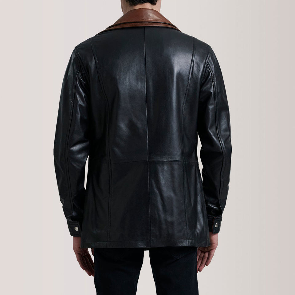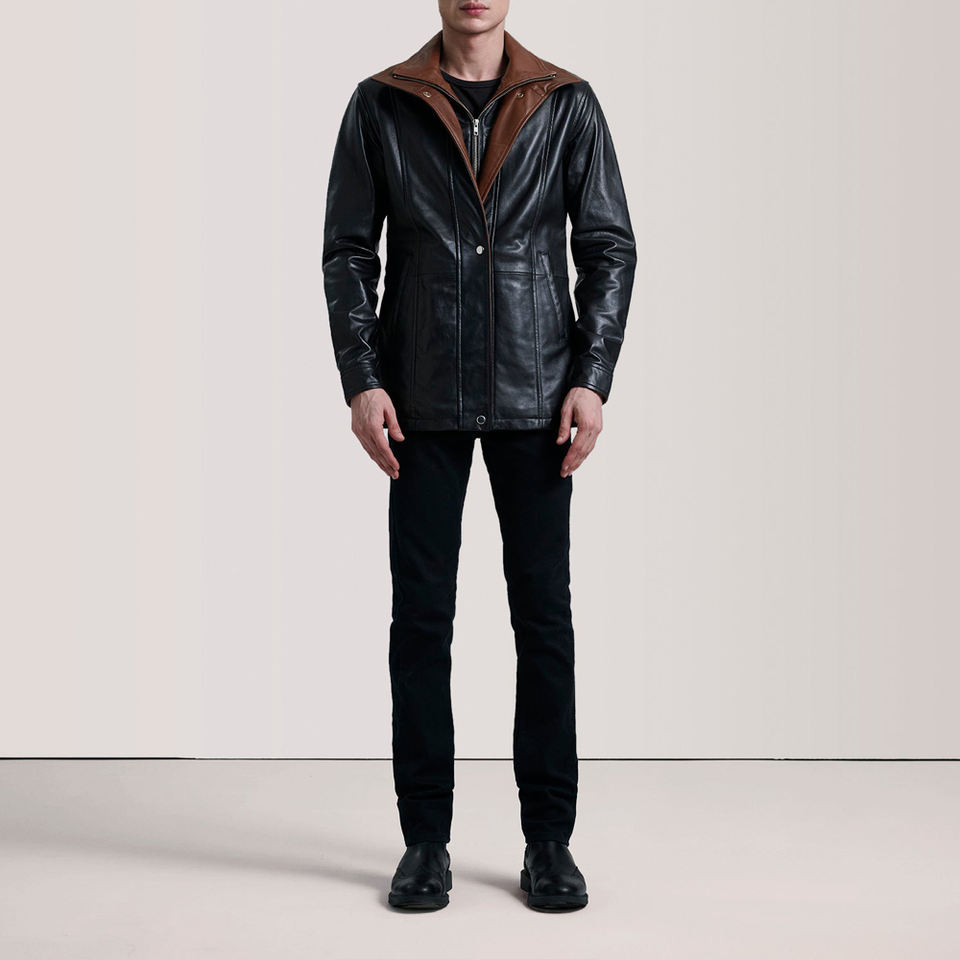 Veste en cuir contrastée noire et marron pour homme, fermeture éclair intérieure, col montant, vêtement d'extérieur en cuir véritable, style long, tendance