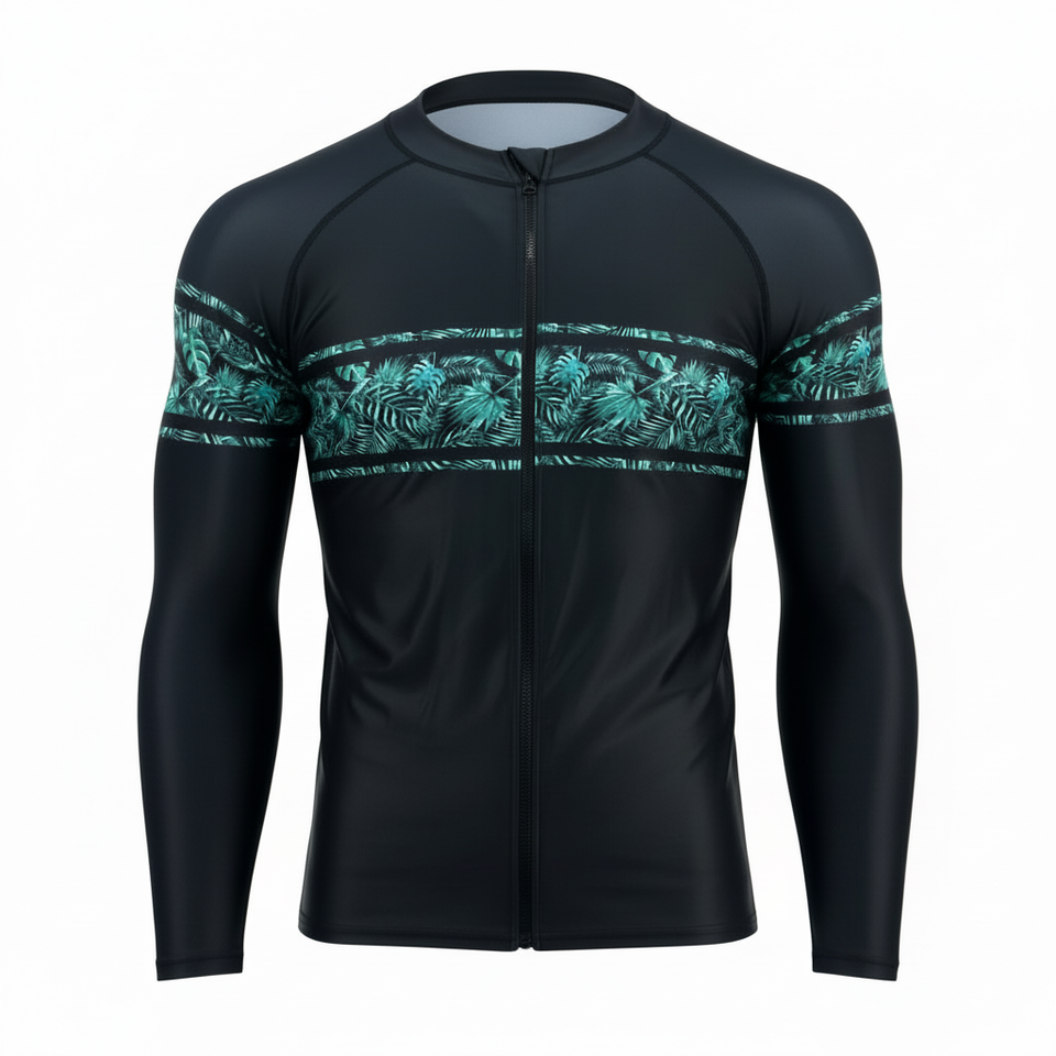 Veste de compression noire pour homme à fermeture éclair, motif floral rayé, manches longues, pour entraînement sportif, longueur intégrale, UPF50, respirante, antibactérienne
