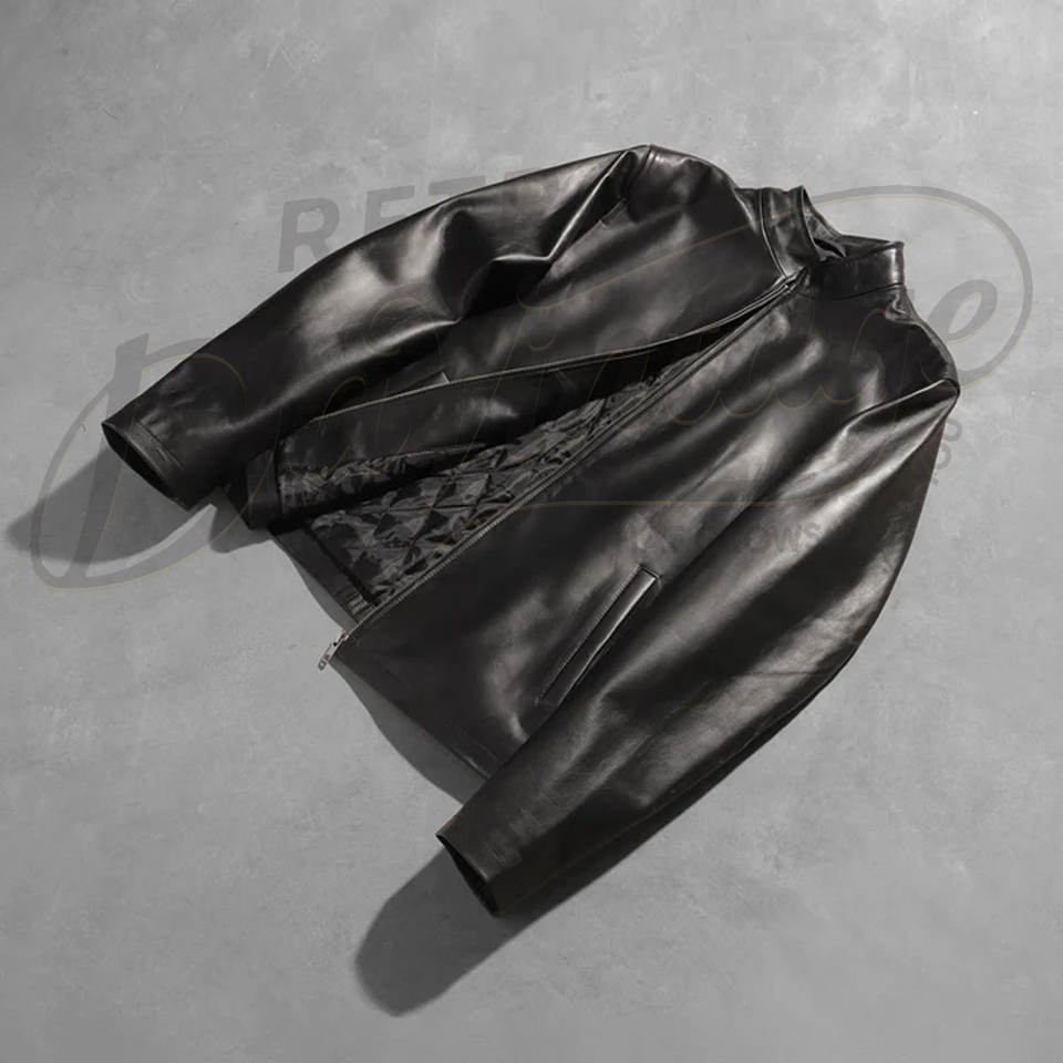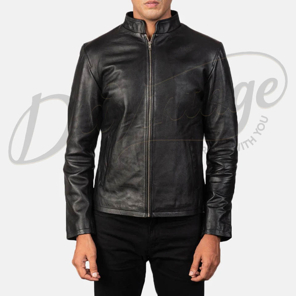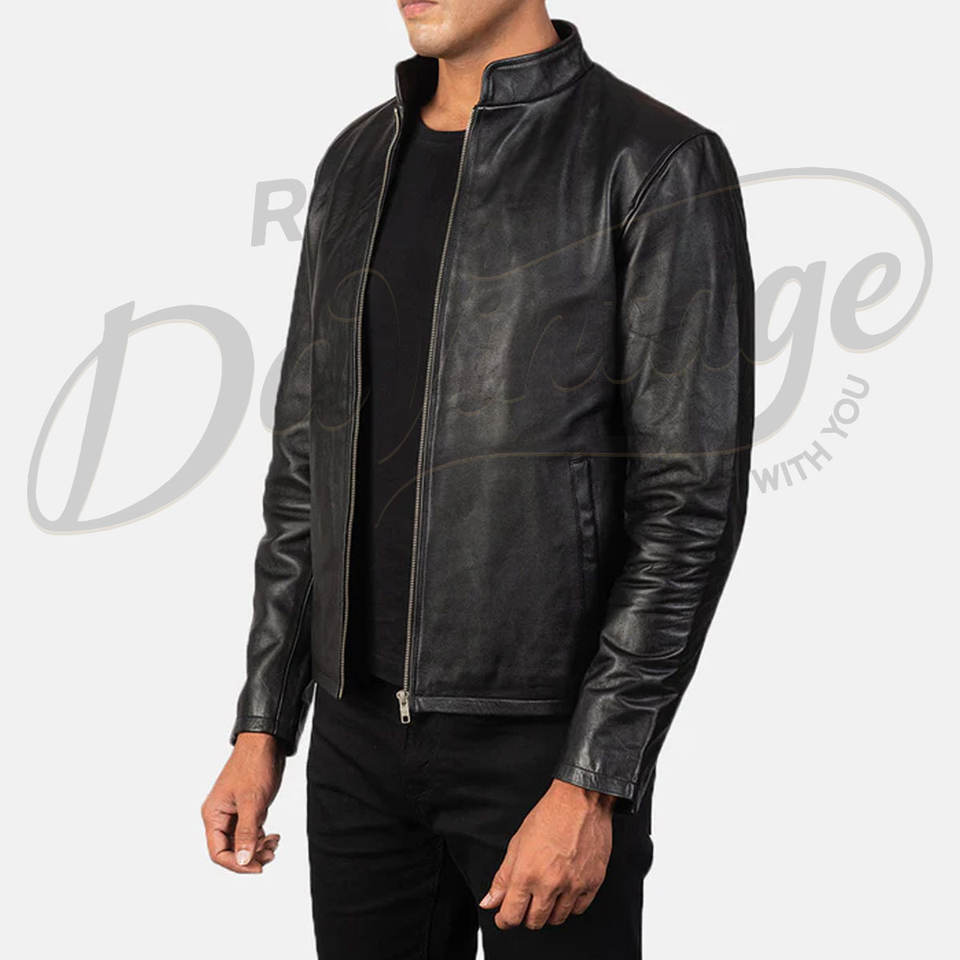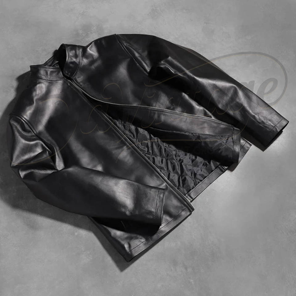 Mens Black Leather Cafe Racer Jacket Slim Fit Real Sheepskin Autumn Winter Casual Moto Coat Band Collar Zip Up Outerwear