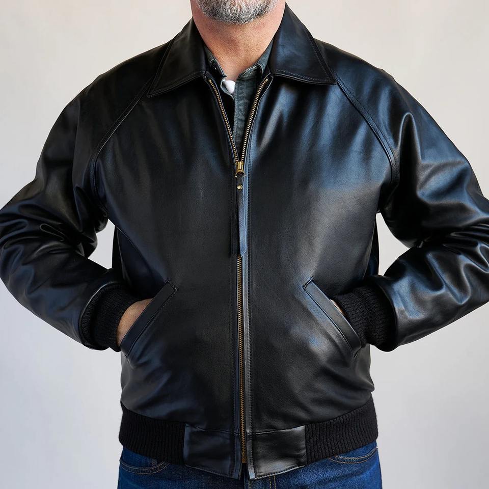 Mens Black Sheep Skin Leather Bomber Jacket Regular Sleeve Stand Collar Vintage Style Winter Eco-Friendly Coat