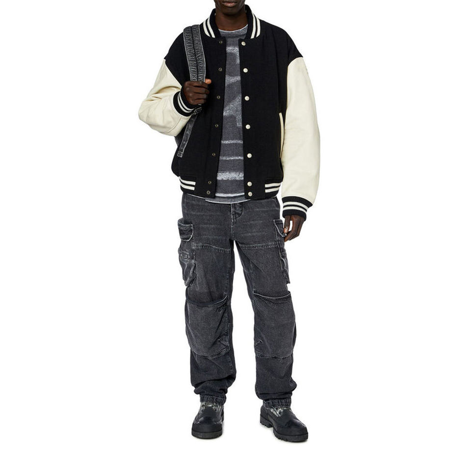 Veste de style universitaire pour homme, noire et crème, bordure côtelée rayée, fermeture à boutons pression, streetwear urbain haut de gamme, veste décontractée tendance