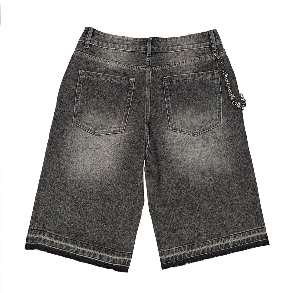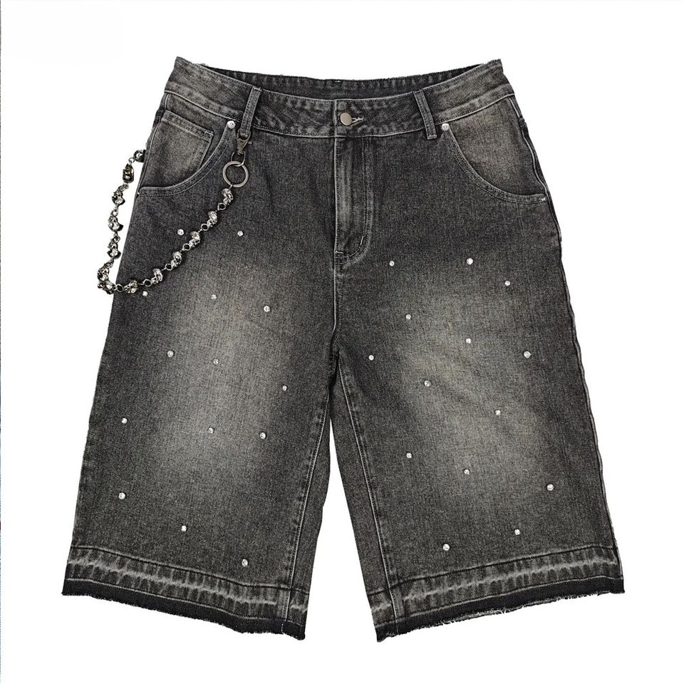 Shorts en jean gris foncé pour homme, ornés de strass et de motifs graphiques, style streetwear hip-hop, coupe ample, avec détail chaîne