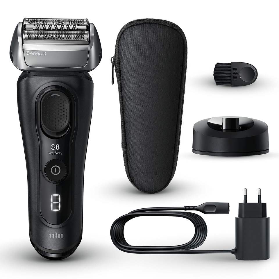 Rasoir électrique pour homme, système à quatre lames, tondeuse intégrée, station de charge, batterie d'une heure, étanche IPX7, couleur noire, pour usage corporel