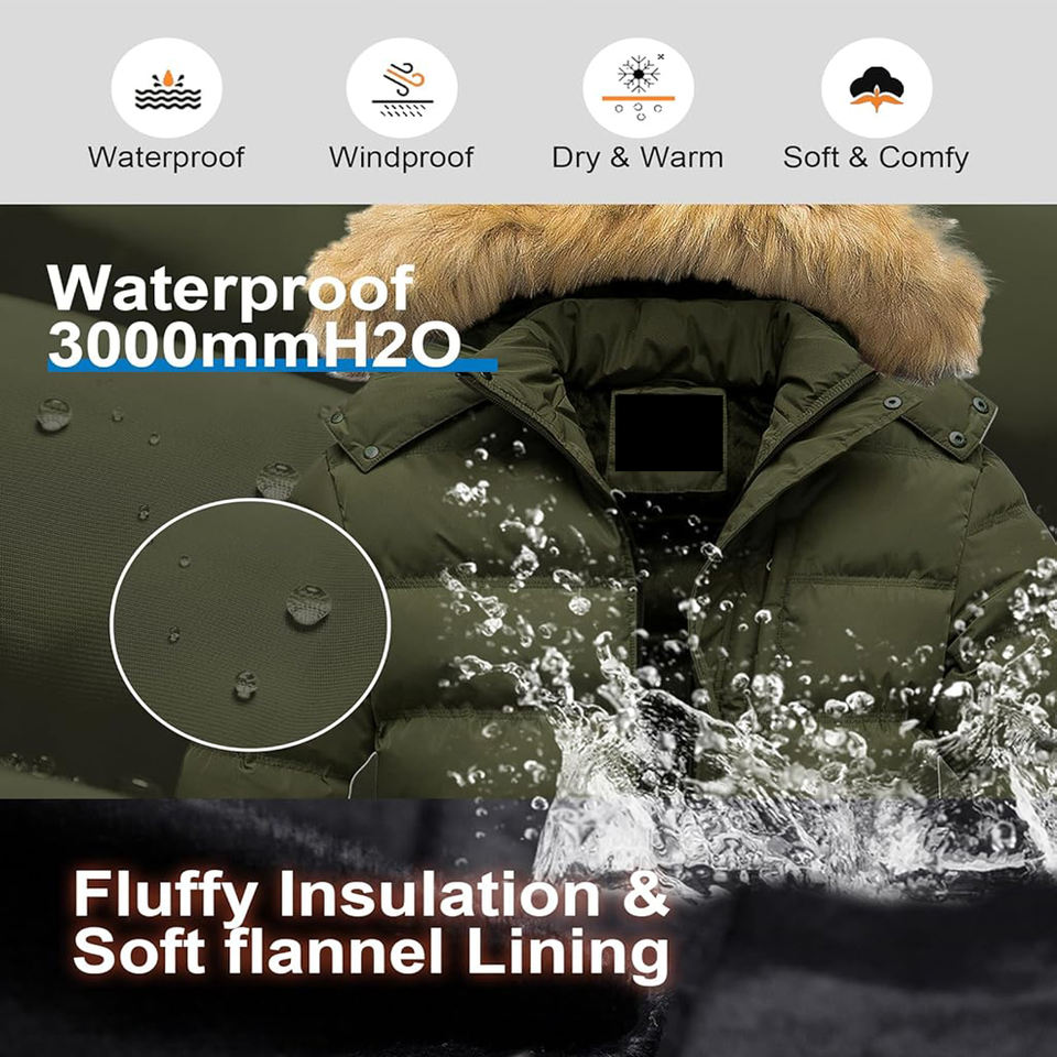 Mens Green Winter Puffer Jacket Thick Warm Parka Coat Waterproof Windproof Outerwear with Removable Faux Fur Hood Snow Ski